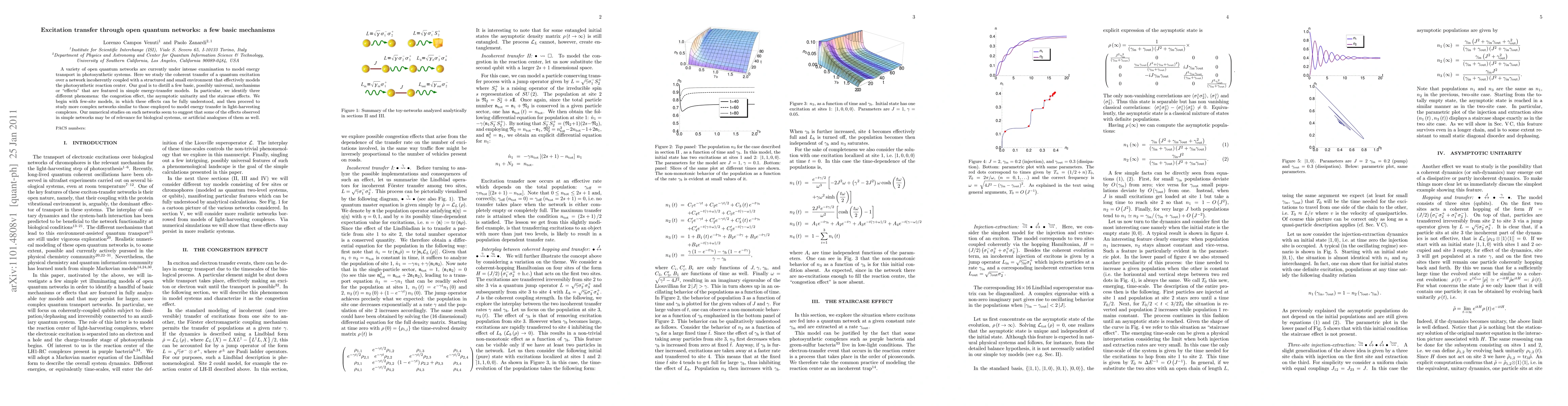 This paper investigates basic mechanisms in open quantum networks modeling energy transport in photosynthetic systems, identifying phenomena like the congestion effect, asymptotic unitarity, and staircase effects. Numerical studies suggest these effects may also apply to biological systems and their artificial counterparts.