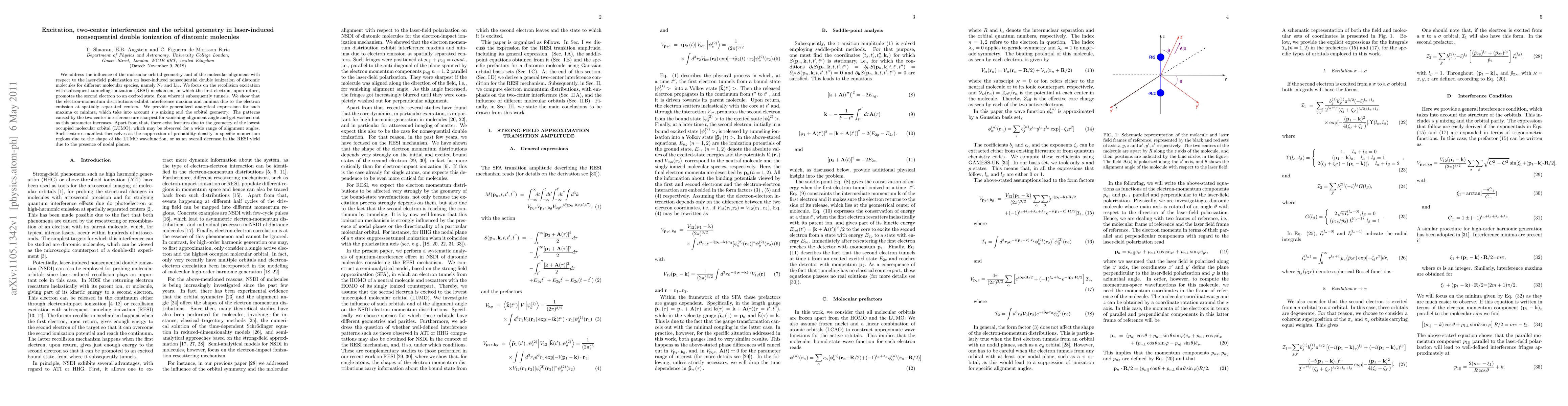 We address the influence of the molecular orbital geometry and of the molecular alignment with respect to the laser-field polarization on laser-induced nonsequential double ionization of diatomic molecules for different molecular species, namely $\mathrm{N}_2$ and $\mathrm{Li}_2$. We focus on the recollision excitation with subsequent tunneling ionization (RESI) mechanism, in which the first electron, upon return, promotes the second electron to an excited state, from where it subsequently tunnels. We show that the electron-momentum distributions exhibit interference maxima and minima due to the electron emission at spatially separated centers. We provide generalized analytical expressions for such maxima or minima, which take into account $s$ $p$ mixing and the orbital geometry. The patterns caused by the two-center interference are sharpest for vanishing alignment angle and get washed out as this parameter increases. Apart from that, there exist features due to the geometry of the lowest occupied molecular orbital (LUMO), which may be observed for a wide range of alignment angles. Such features manifest themselves as the suppression of probability density in specific momentum regions due to the shape of the LUMO wavefunction, or as an overall decrease in the RESI yield due to the presence of nodal planes.