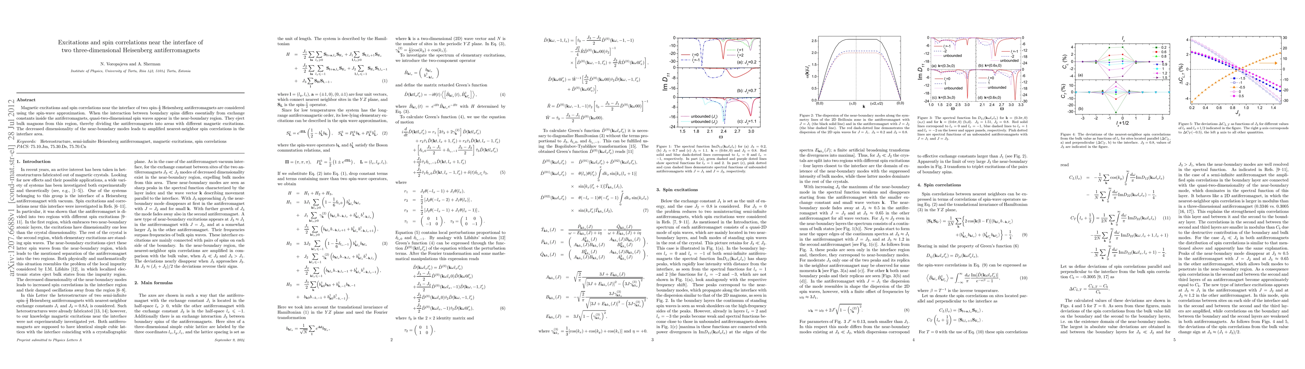 This study investigates magnetic excitations and spin correlations at the interface of two 3D Heisenberg antiferromagnets using spin-wave approximation, revealing quasi-2D spin waves that emerge when boundary interactions differ from bulk constants, leading to distinct magnetic excitations and enhanced nearest-neighbor spin correlations.