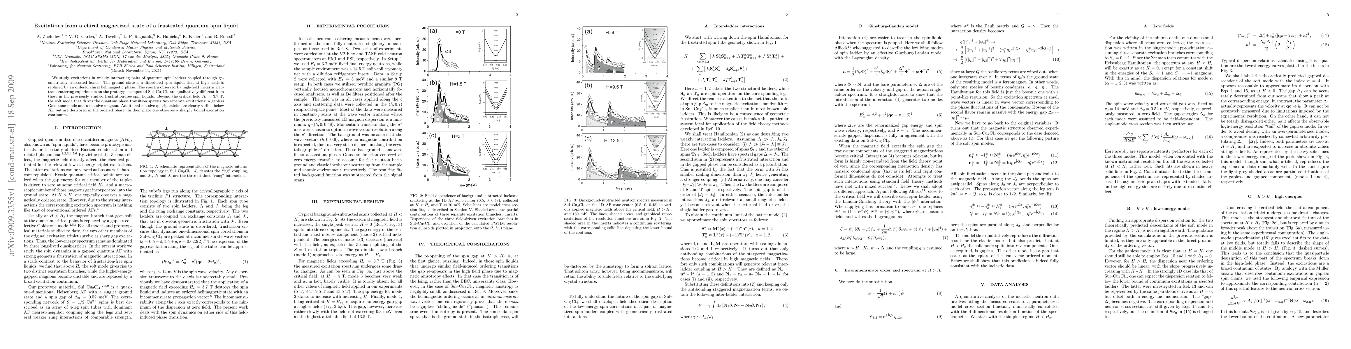 We study excitations in weakly interacting pairs of quantum spin ladders coupled through geometrically frustrated bonds. The ground state is a disordered spin liquid, that at high fields is replaced by an ordered chiral helimagnetic phase. The spectra observed by high-field inelastic neutron scattering experiments on the prototype compound Sul-Cu2Cl4 are qualitatively different from those in the previously studied frustration-free spin liquids. Beyond the critical field Hc=3.7 T, the soft mode that drives the quantum phase transition spawns two separate excitations: a gapless Goldstone mode and a massive magnon. Additional massive quasiparticles are clearly visible below Hc, but are destroyed in the ordered phase. In their place one observes a sharply bound excitation continuum.