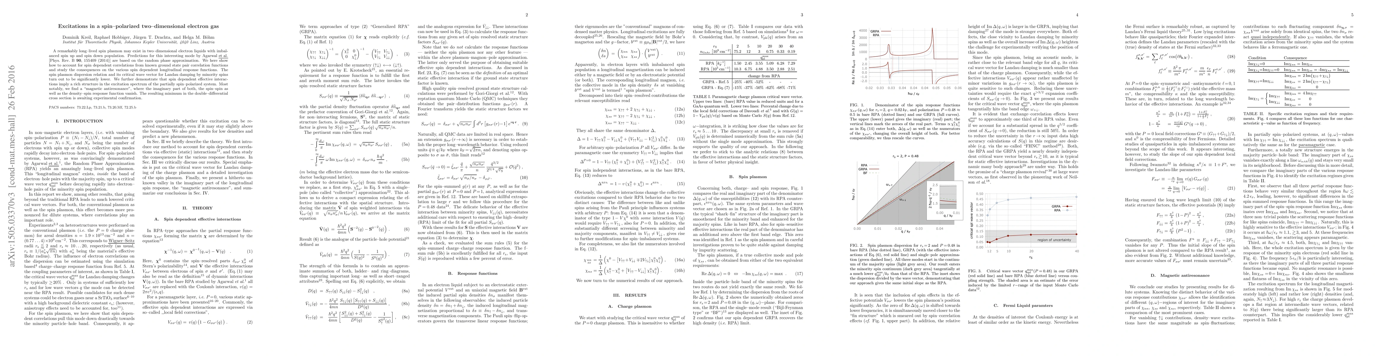 A remarkably long-lived spin plasmon may exist in two-dimensional electron liquids with imbalanced spin up and spin down population. Predictions for this interesting mode by Agarwal et al. [Phys. Rev. B 90, 155409 (2014)] are based on the random phase approximation. We here show how to account for spin dependent correlations from known ground state pair correlation functions and study the consequences on the various spin dependent longitudinal response functions. The spin plasmon dispersion relation and its critical wave vector for Landau damping by minority spins turn out to be significantly lowered. We further demonstrate that spin dependent effective interactions imply a rich structure in the excitation spectrum of the partially spin-polarized system. Most notably, we find a "magnetic antiresonance", where the imaginary part of both, the spin-spin as well as the density-spin response function vanish. The resulting minimum in the double-differential cross section is awaiting experimental confirmation.