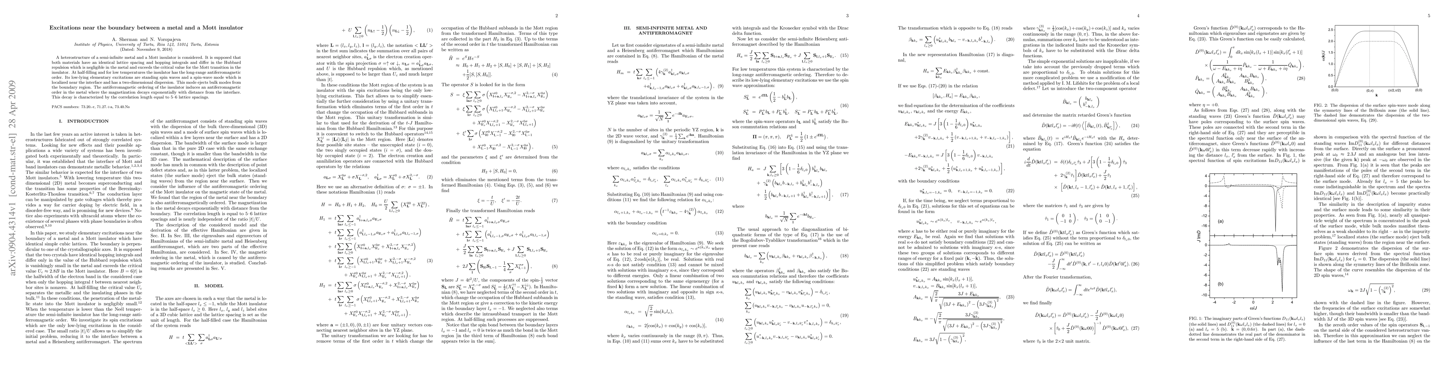 This paper investigates excitations at the boundary between a metal and a Mott insulator, finding that the insulator's antiferromagnetic order induces a decaying antiferromagnetic order in the metal, characterized by a correlation length of 5-6 lattice spacings. The insulator's interface hosts a unique spin-wave mode with two-dimensional dispersion, which influences the metal's bulk modes.