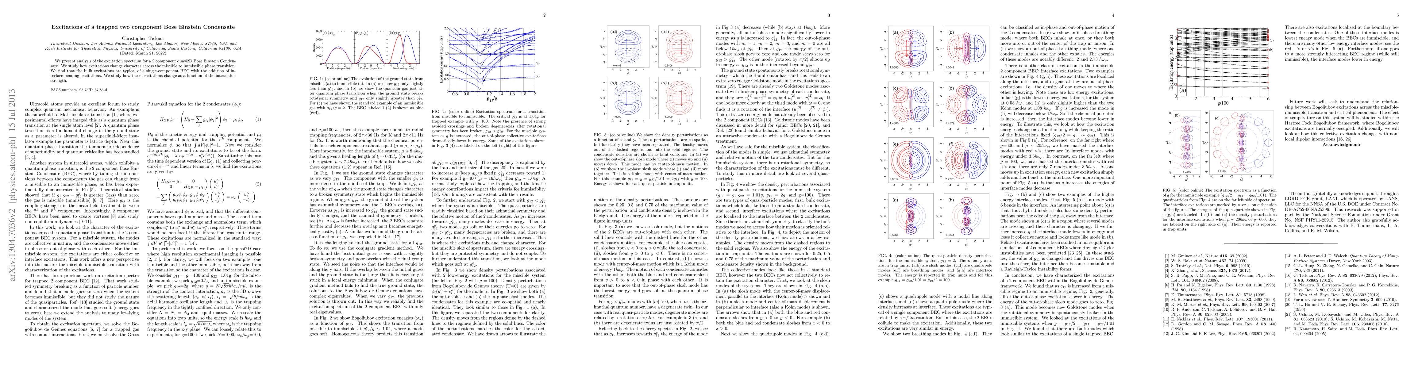 We present analysis of the excitation spectrum for a 2 component quasi2D Bose Einstein Condensate. We study how the character of the excitations change across the miscible to immiscible phase transition. We find that the bulk excitations are typical of a single-component BEC with the addition of interface bending excitations. We study how these excitations change as a function of the interaction strength.