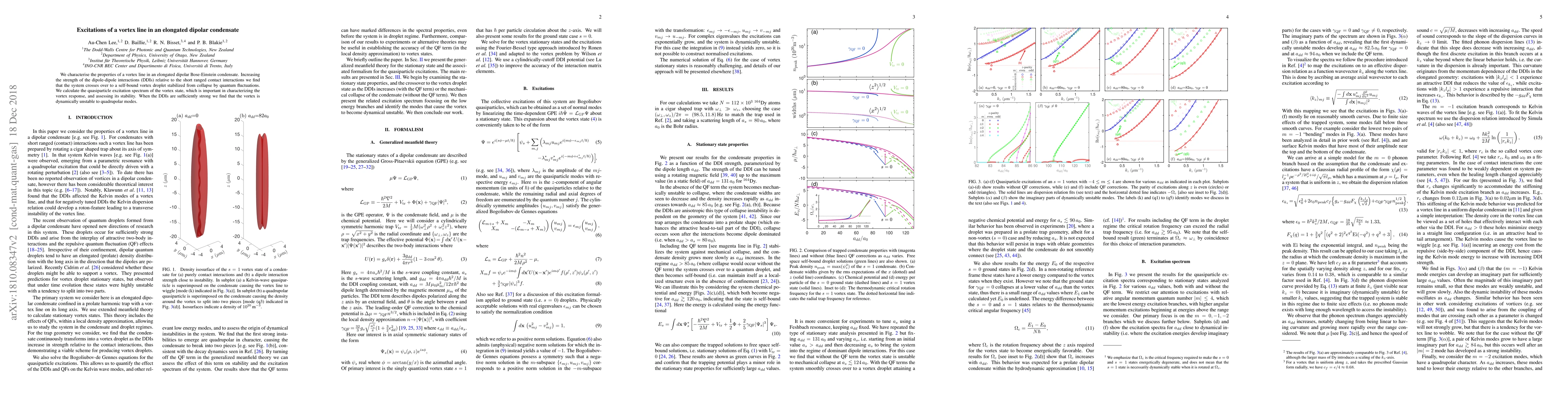 We characterise the properties of a vortex line in an elongated dipolar Bose-Einstein condensate. Increasing the strength of the dipole-dipole interactions (DDIs) relative to the short ranged contact interactions we find that the system crosses over to a self-bound vortex droplet stabilized from collapse by quantum fluctuations. We calculate the quasiparticle excitation spectrum of the vortex state, which is important in characterizing the vortex response, and assessing its stability. When the DDIs are sufficiently strong we find that the vortex is dynamically unstable to quadrupolar modes.