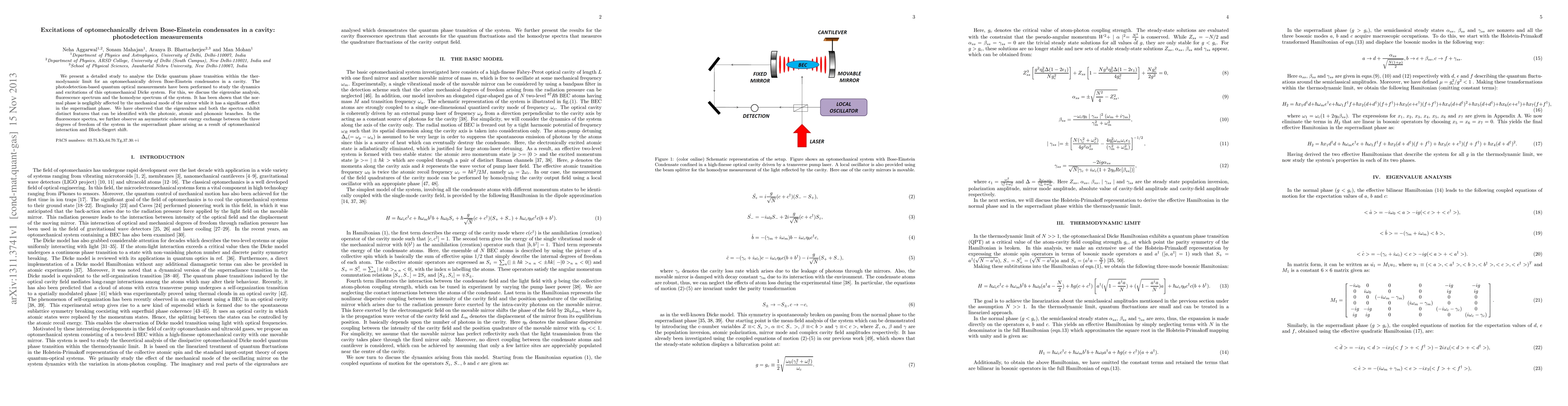 We present a detailed study to analyse the Dicke quantum phase transition within the thermodynamic limit for an optomechanically driven Bose-Einstein condensates in a cavity. The photodetection-based quantum optical measurements have been performed to study the dynamics and excitations of this optomechanical Dicke system. For this, we discuss the eigenvalue analysis, fluorescence spectrum and the homodyne spectrum of the system. It has been shown that the normal phase is negligibly affected by the mechanical mode of the mirror while it has a significant effect in the superradiant phase. We have observed that the eigenvalues and both the spectra exhibit distinct features that can be identified with the photonic, atomic and phononic branches. In the fluorescence spectra, we further observe an asymmetric coherent energy exchange between the three degrees of freedom of the system in the superradiant phase arising as a result of optomechanical interaction and Bloch-Siegert shift.