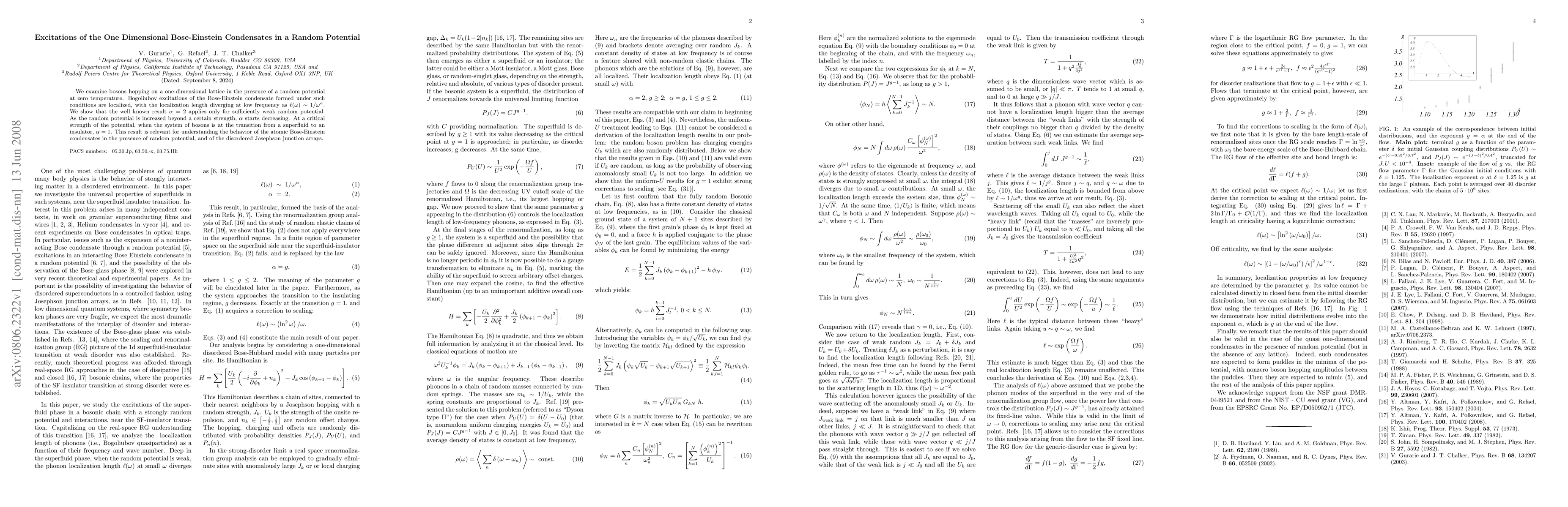 We examine bosons hopping on a one-dimensional lattice in the presence of a random potential at zero temperature. Bogoliubov excitations of the Bose-Einstein condensate formed under such conditions are localized, with the localization length diverging at low frequency as $\ell(\omega)\sim 1/\omega^\alpha$. We show that the well known result $\alpha=2$ applies only for sufficiently weak random potential. As the random potential is increased beyond a certain strength, $\alpha$ starts decreasing. At a critical strength of the potential, when the system of bosons is at the transition from a superfluid to an insulator, $\alpha=1$. This result is relevant for understanding the behavior of the atomic Bose-Einstein condensates in the presence of random potential, and of the disordered Josephson junction arrays.