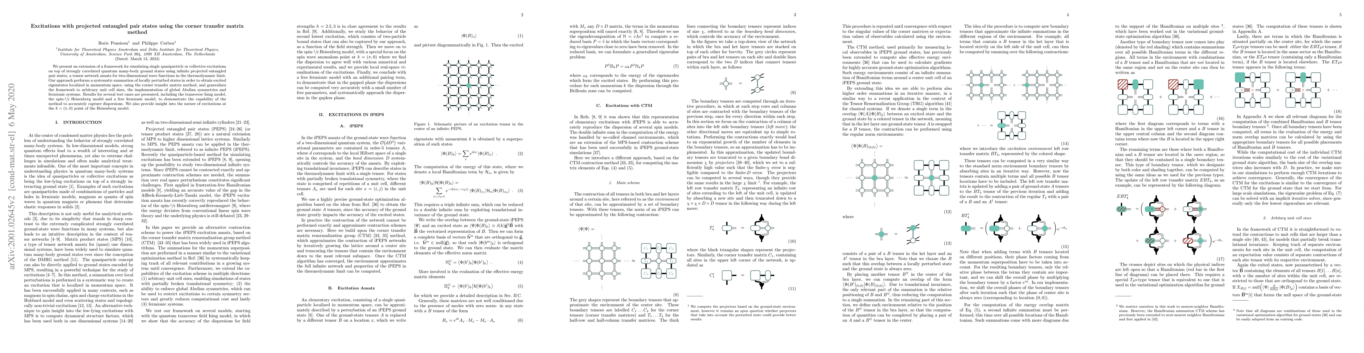 We present an extension of a framework for simulating single quasiparticle or collective excitations on top of strongly correlated quantum many-body ground states using infinite projected entangled pair states, a tensor network ansatz for two-dimensional wave functions in the thermodynamic limit. Our approach performs a systematic summation of locally perturbed states in order to obtain excited eigenstates localized in momentum space, using the corner transfer matrix method, and generalizes the framework to arbitrary unit cell sizes, the implementation of global Abelian symmetries and fermionic systems. Results for several test cases are presented, including the transverse Ising model, the spin-$\frac{1}{2}$ Heisenberg model and a free fermionic model, to demonstrate the capability of the method to accurately capture dispersions. We also provide insight into the nature of excitations at the $k=(\pi,0)$ point of the Heisenberg model.