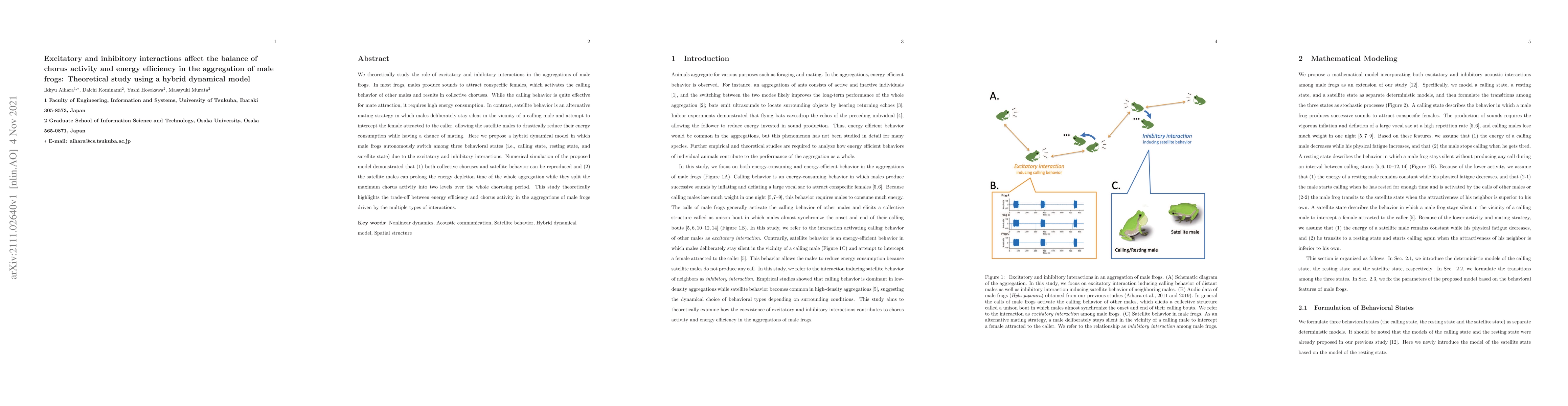 We theoretically study the role of excitatory and inhibitory interactions in the aggregations of male frogs. In most frogs, males produce sounds to attract conspecific females, which activates the calling behavior of other males and results in collective choruses. While the calling behavior is quite effective for mate attraction, it requires high energy consumption. In contrast, satellite behavior is an alternative mating strategy in which males deliberately stay silent in the vicinity of a calling male and attempt to intercept the female attracted to the caller, allowing the satellite males to drastically reduce their energy consumption while having a chance of mating. Here we propose a hybrid dynamical model in which male frogs autonomously switch among three behavioral states (i.e., calling state, resting state, and satellite state) due to the excitatory and inhibitory interactions. Numerical simulation of the proposed model demonstrated that (1) both collective choruses and satellite behavior can be reproduced and (2) the satellite males can prolong the energy depletion time of the whole aggregation while they split the maximum chorus activity into two levels over the whole chorusing period. This study theoretically highlights the trade-off between energy efficiency and chorus activity in the aggregations of male frogs driven by the multiple types of interactions.