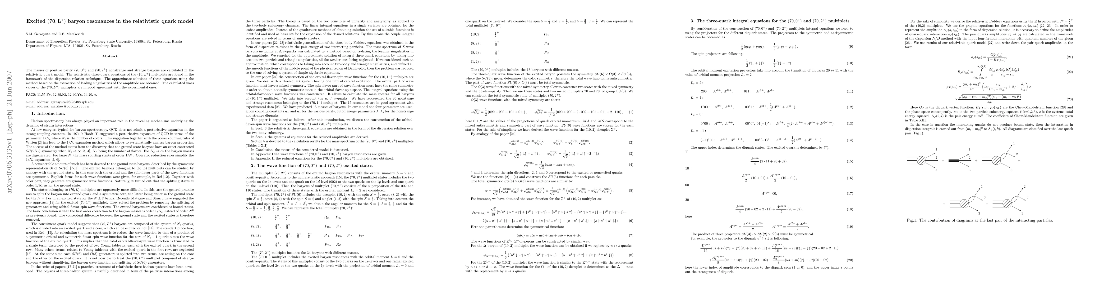 The masses of positive parity $(70,0^+)$ and $(70,2^+)$ nonstrange and strange baryons are calculated in the relativistic quark model. The relativistic three-quark equations of the $(70,L^+)$ multiplets are found in the framework of the dispersion relation technique. The approximate solutions of these equations using the method based on the extraction of leading singularities of the amplitude are obtained. The calculated mass values of the $(70,L^+)$ multiplets are in good agreement with the experimental ones.