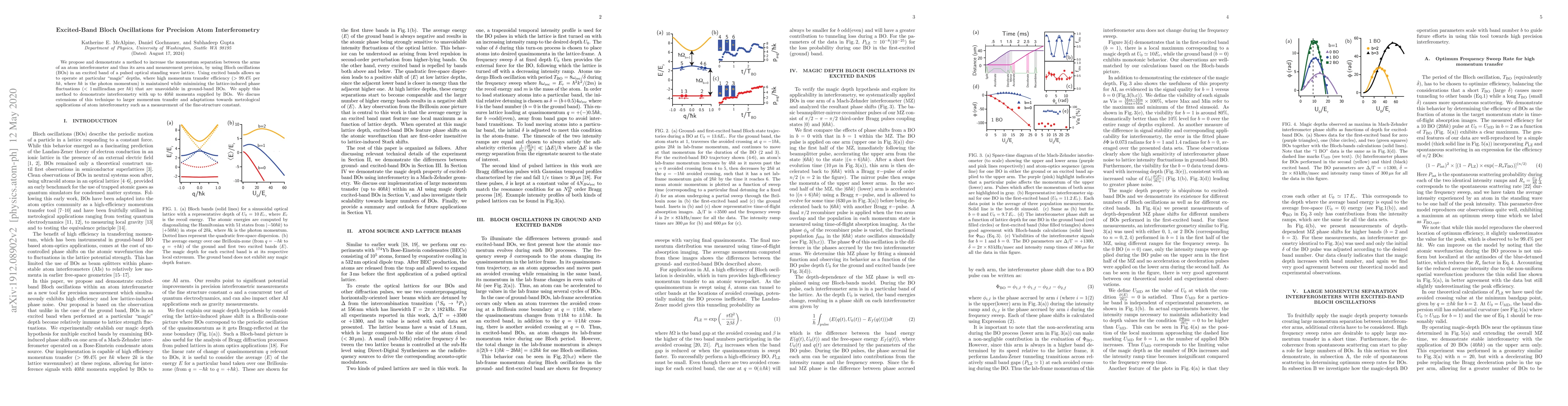 This paper proposes a technique to enhance atom interferometry precision by employing Bloch oscillations in excited bands of a pulsed optical lattice, achieving high momentum transfer efficiency and minimal phase fluctuations, and demonstrates its application in interferometry with up to 40$\hbar k$ momenta.