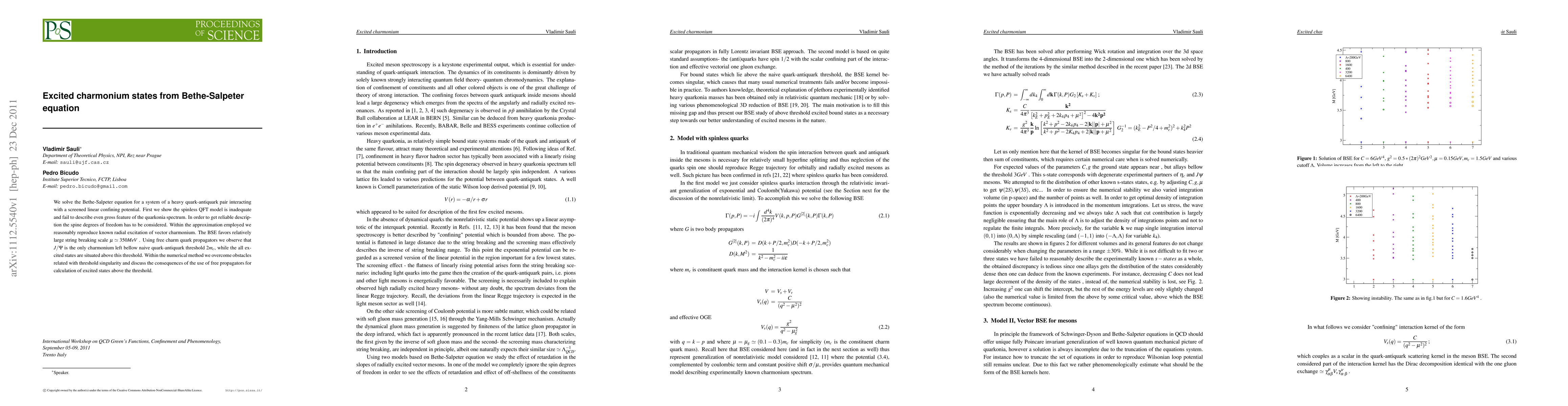 This study uses the Bethe-Salpeter equation to describe excited charmonium states in heavy quark-antiquark systems, showing that spinless QFT models are inadequate and favoring large string breaking scale. It reasonably reproduces known radial excitation of vector charmonium.