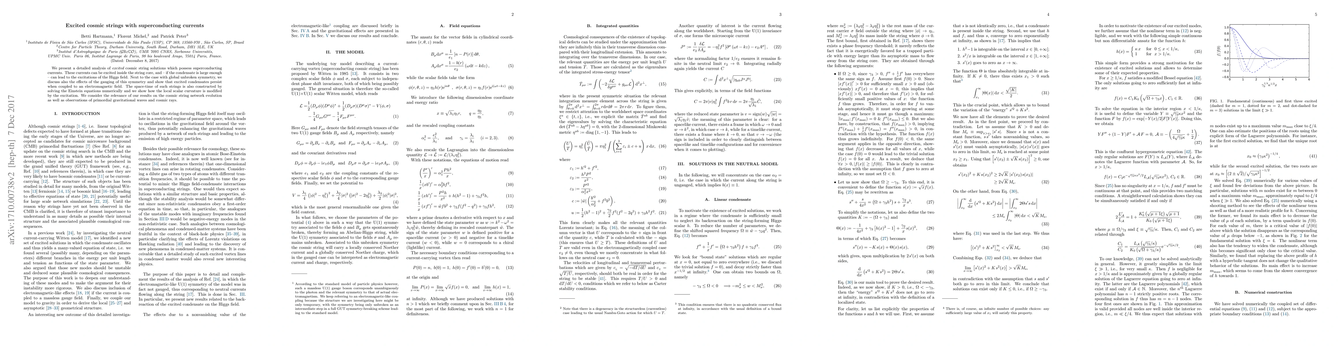 This paper analyzes excited cosmic string solutions with superconducting currents, exploring their impact on Higgs field excitations and modifications to local scalar curvature. It also examines the implications for cosmic string network evolution and potential observational signatures in gravitational waves and cosmic rays.