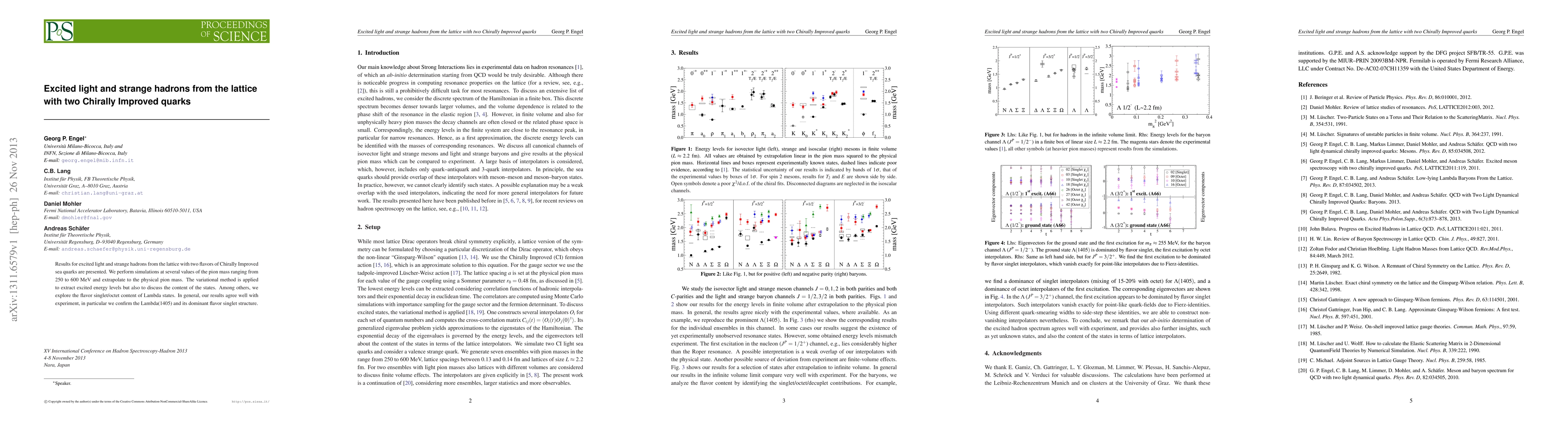 This paper presents lattice QCD results for excited light and strange hadrons using two flavors of Chirally Improved quarks, simulating at various pion masses and extrapolating to the physical pion mass. The study confirms the Lambda(1405) resonance and its dominant flavor singlet structure, aligning well with experimental data.