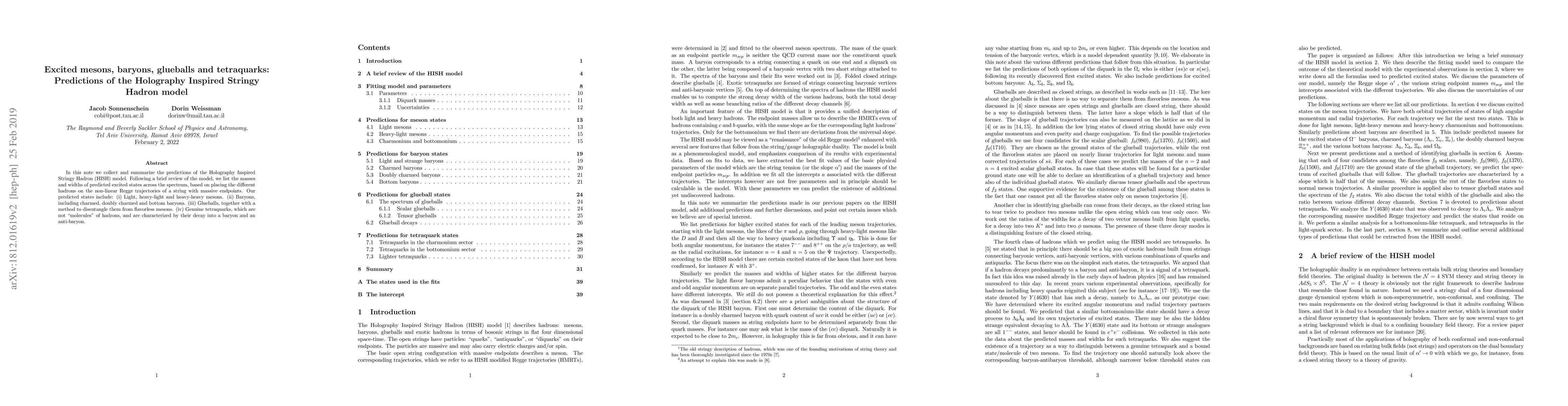 In this note we collect and summarize the predictions of the Holography Inspired Stringy Hadron (HISH) model. We list the masses and widths of predicted excited states across the spectrum, based on placing the different hadrons on the non-linear Regge trajectories of a string with massive endpoints. Our predicted states include: (i) Light, heavy-light and heavy-heavy mesons. (ii) Baryons, including charmed, doubly charmed and bottom baryons. (iii) Glueballs, together with a method to disentangle them from flavorless mesons. (iv) Genuine tetraquarks, which are not "molecules" of hadrons, and are characterized by their decay into a baryon and an anti-baryon.