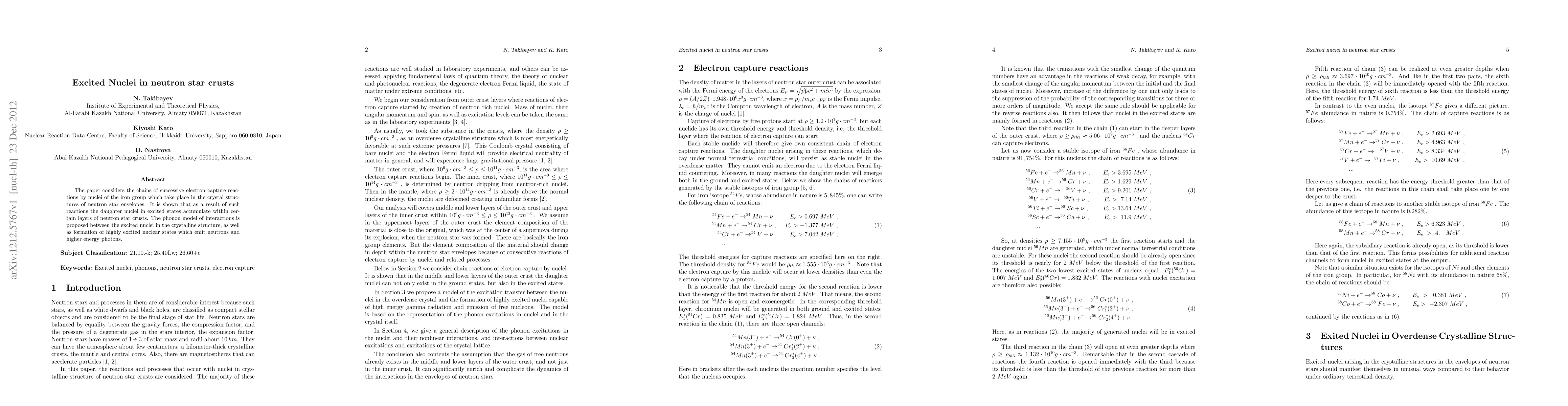 The paper considers the chains of successive electron capture reactions by nuclei of the iron group which take place in the crystal structures of neutron star envelopes. It is shown that as a result of such reactions the daughter nuclei in excited states accumulate within certain layers of neutron star crusts. The phonon model of interactions is proposed between the excited nuclei in the crystalline structure, as well as formation of highly excited nuclear states which emit neutrons and higher energy photons.