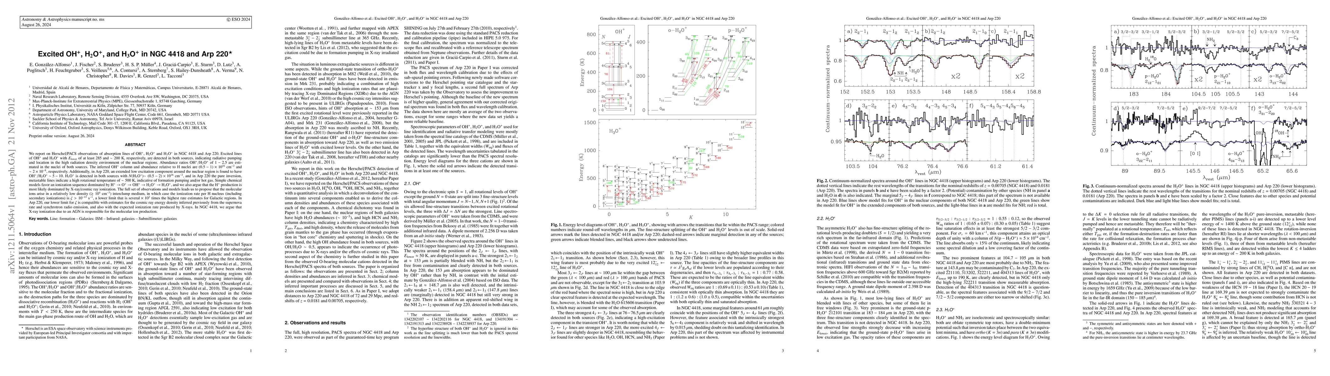 This paper reports on Herschel/PACS observations detecting excited OH+, H2O+, and H3O+ lines in NGC 4418 and Arp 220, indicating high radiation density environments in their nuclei. The study finds evidence of radiative pumping and high ionization rates, suggesting X-ray/cosmic ray ionization dominates H+ production, with zeta>10^{-13} s-1 in the interclump medium.