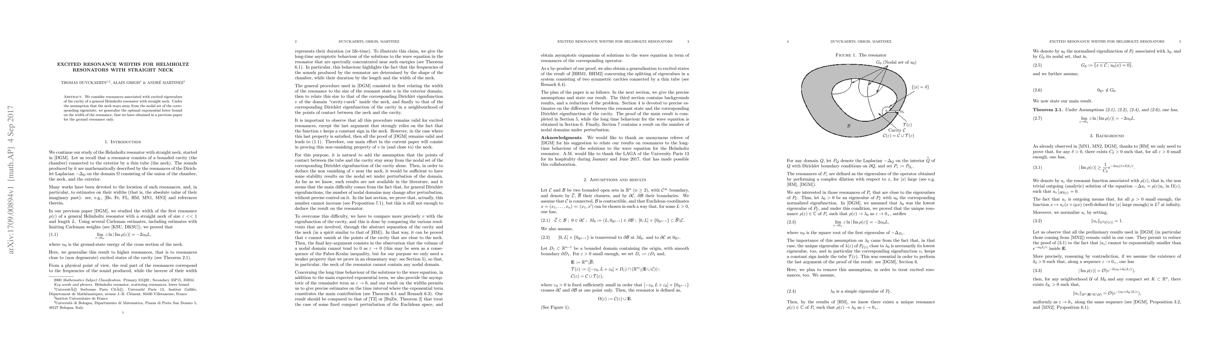 We consider resonances associated with excited eigenvalues of the cavity of a general Helmholtz resonator with straight neck. Under the assumption that the neck stays away from the nodal set of the corresponding eigenstate, we generalise the optimal exponential lower bound on the width of the resonance, that we have obtained in a previous paper for the ground resonance only.