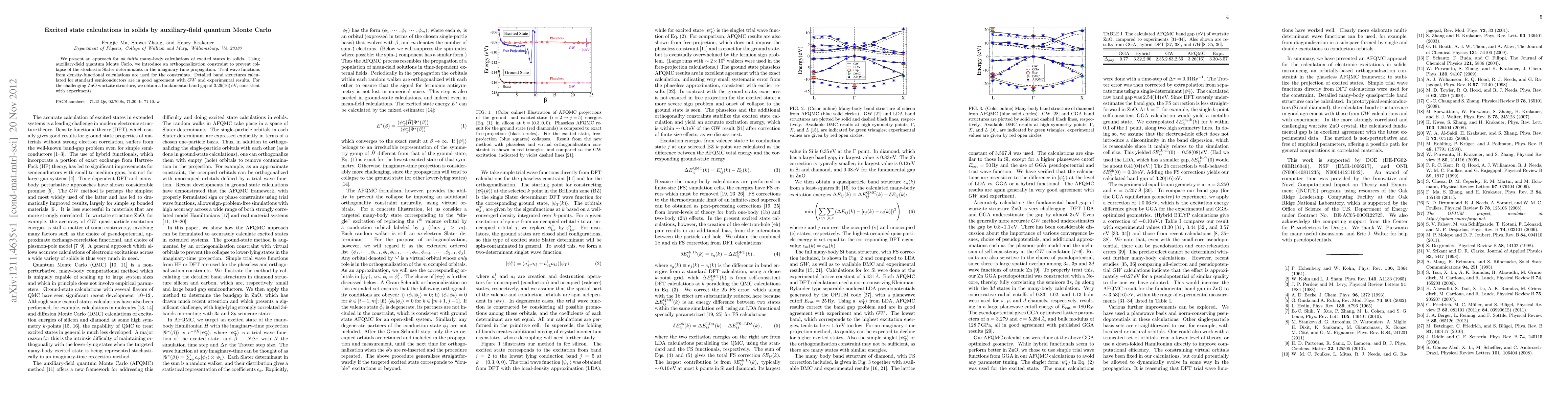 This research introduces an auxiliary-field quantum Monte Carlo method to accurately calculate excited states in solids, using density-functional calculations for constraints and achieving precise band gap values for semiconductors and ZnO, aligning well with experimental data.