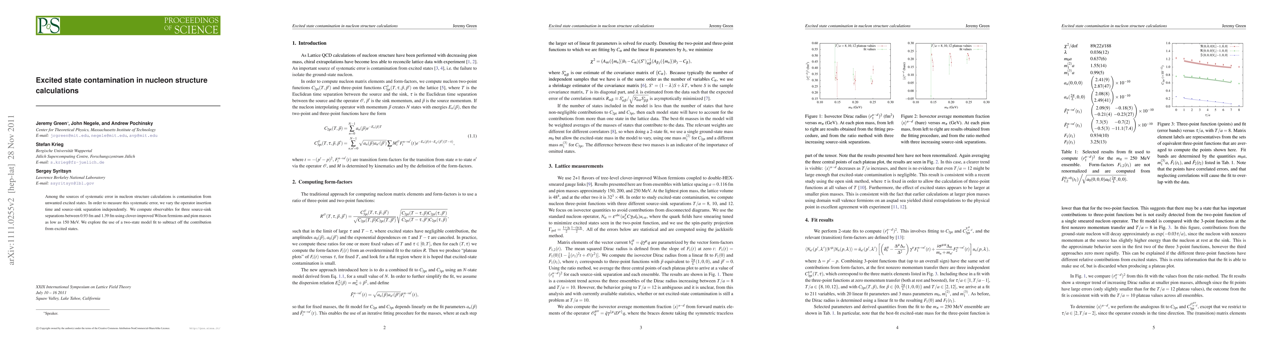 Among the sources of systematic error in nucleon structure calculations is contamination from unwanted excited states. In order to measure this systematic error, we vary the operator insertion time and source-sink separation independently. We compute observables for three source-sink separations between 0.93 fm and 1.39 fm using clover-improved Wilson fermions and pion masses as low as 150 MeV. We explore the use of a two-state model fit to subtract off the contribution from excited states.