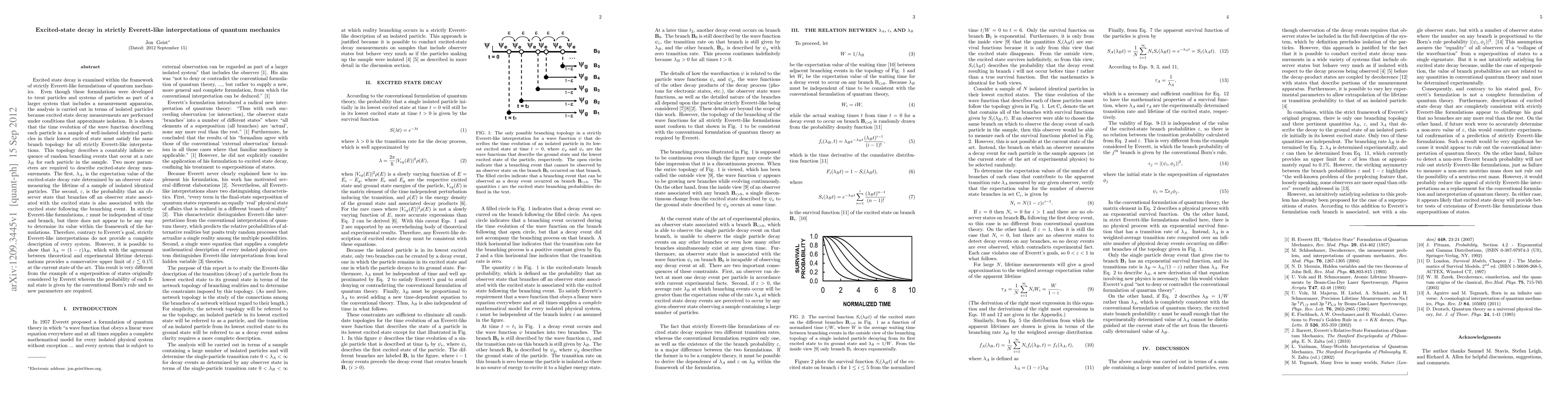 This paper examines excited-state decay in strictly Everett-like (SEL) formulations of quantum mechanics, showing that all formulations share a common branch topology for isolated particles. It concludes that SEL interpretations lack a complete description due to an undetermined parameter, epsilon, but finds a relationship between decay rates that sets a conservative upper limit of 0.1% for epsilon.