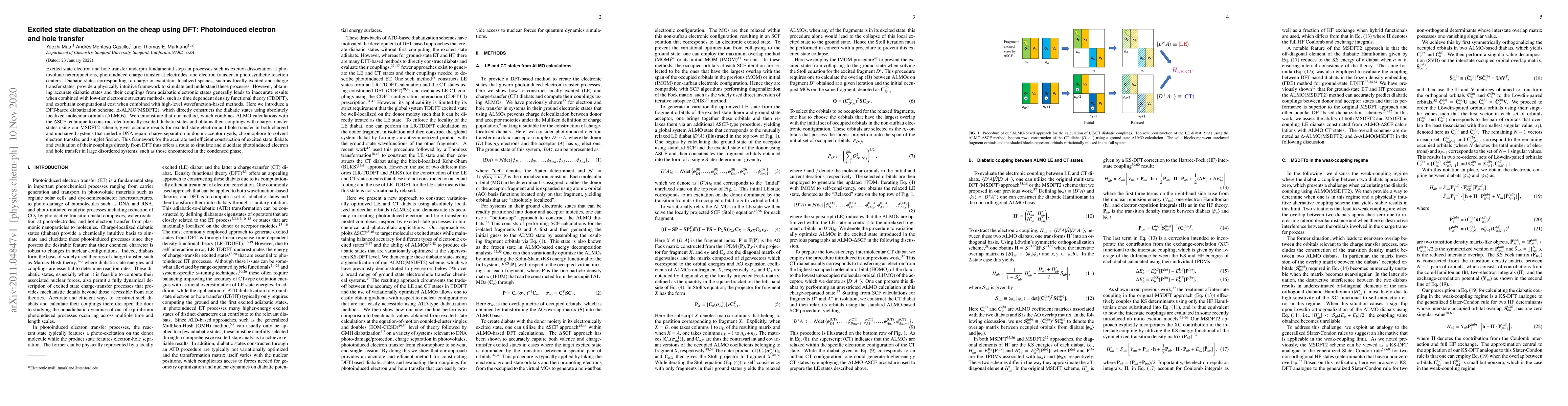 Excited state electron and hole transfer underpin fundamental steps in processes such as exciton dissociation at photovoltaic heterojunctions, photoinduced charge transfer at electrodes, and electron transfer in photosynthetic reaction centers. Diabatic states corresponding to charge or excitation localized species, such as locally excited and charge transfer states, provide a physically intuitive framework to simulate and understand these processes. However, obtaining accurate diabatic states and their couplings from adiabatic electronic states generally leads to inaccurate results when combined with low-tier electronic structure methods, such as time dependent density functional theory (TDDFT), and exorbitant computational cost when combined with high-level wavefunction-based methods. Here we introduce a DFT-based diabatization scheme, {\Delta}-ALMO(MSDFT2), which directly constructs the diabatic states using absolutely localized molecular orbitals (ALMOs). We demonstrate that our method, which combines ALMO calculations with the {\Delta}SCF technique to construct electronically excited diabatic states and obtains their couplings with charge-transfer states using our MSDFT2 scheme, gives accurate results for excited state electron and hole transfer in both charged and uncharged systems that underlie DNA repair, charge separation in donor-acceptor dyads, chromophore-to-solvent electron transfer, and singlet fission. This framework for the accurate and efficient construction of excited state diabats and evaluation of their couplings directly from DFT thus offers a route to simulate and elucidate photoinduced electron and hole transfer in large disordered systems, such as those encountered in the condensed phase.