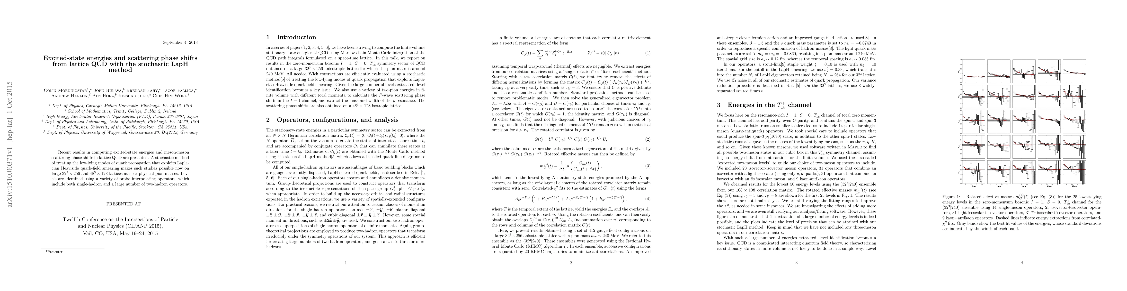 This paper presents recent advancements in lattice QCD for computing excited-state energies and meson-meson scattering phase shifts using a stochastic LapH method. The method enables studies on large lattices at near physical pion masses, utilizing various probe operators for level identification.