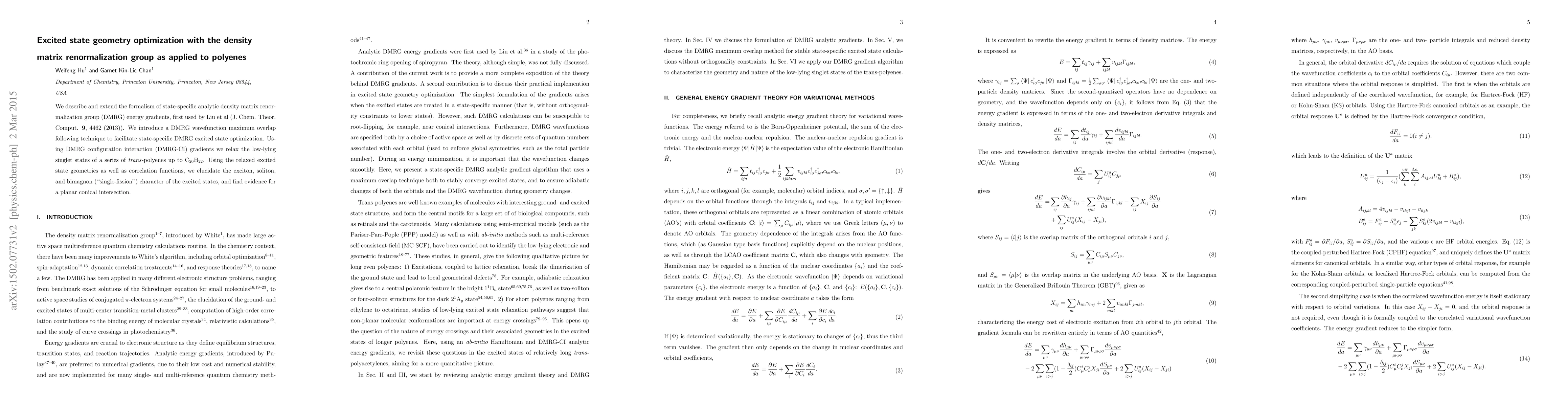 We describe and extend the formalism of state-specific analytic density matrix renormalization group (DMRG) energy gradients, first used by Liu et al (J. Chem. Theor.Comput. 9, 4462 (2013)). We introduce a DMRG wavefunction maximum overlap following technique to facilitate state-specific DMRG excited state optimization. Using DMRG configuration interaction (DMRG-CI) gradients we relax the low-lying singlet states of a series of trans-polyenes up to C20H22. Using the relaxed excited state geometries as well as correlation functions, we elucidate the exciton, soliton, and bimagnon ("single-fission") character of the excited states, and find evidence for a planar conical intersection.
