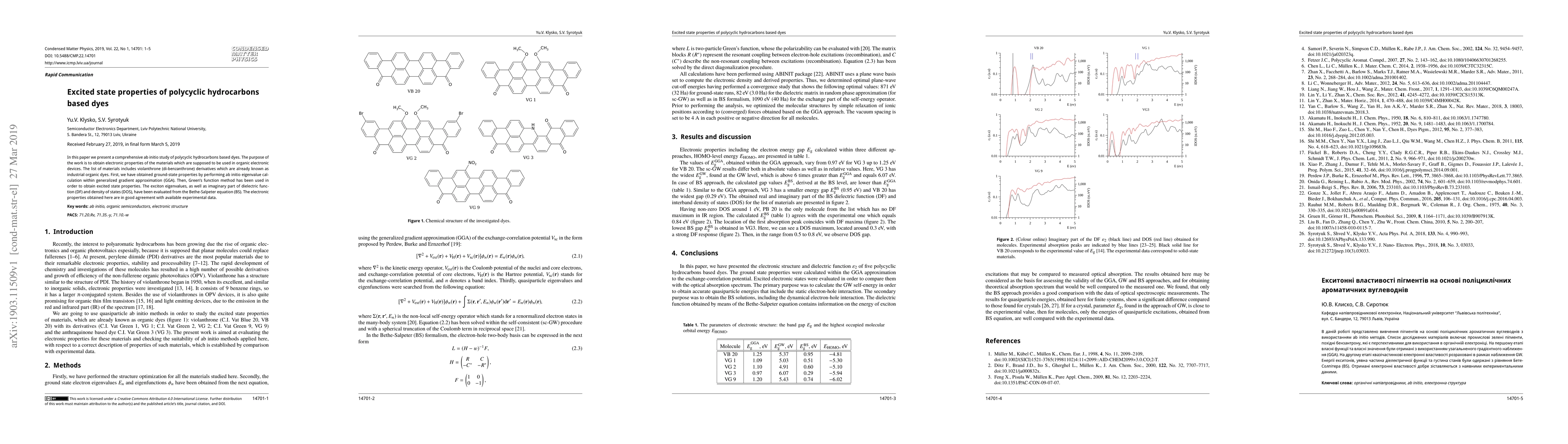 In this paper we present a comprehensive ab initio study of polycyclic hydrocarbons based dyes. The purpose of the work is to obtain electronic properties of the materials which are supposed to be used in organic electronic devices. The list of materials includes violanthrone (di-benzanthrone) derivatives which are already known as industrial organic dyes. First, we have obtained ground-state properties by performing ab initio eigenvalue calculation within generalized gradient approximation (GGA). Then, Green's function method has been used in order to obtain excited state properties. The exciton eigenvalues, as well as imaginary part of dielectric function (DF) and density of states (DOS), have been evaluated from the Bethe-Salpeter equation (BS). The electronic properties obtained here are in good agreement with available experimental data.