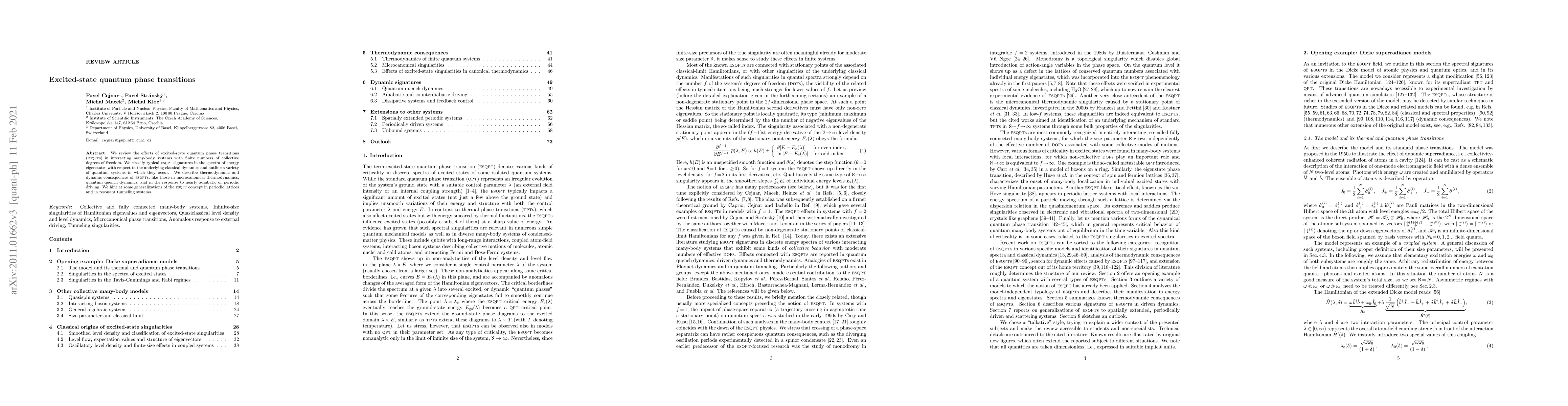 This paper reviews the phenomena of excited-state quantum phase transitions (ESQPTs) in many-body systems, classifying their signatures and discussing their thermodynamic and dynamic consequences in various quantum systems, including microcanonical thermodynamics and quantum quench dynamics. It also explores generalizations of ESQPTs in periodic lattices and resonant tunneling systems.