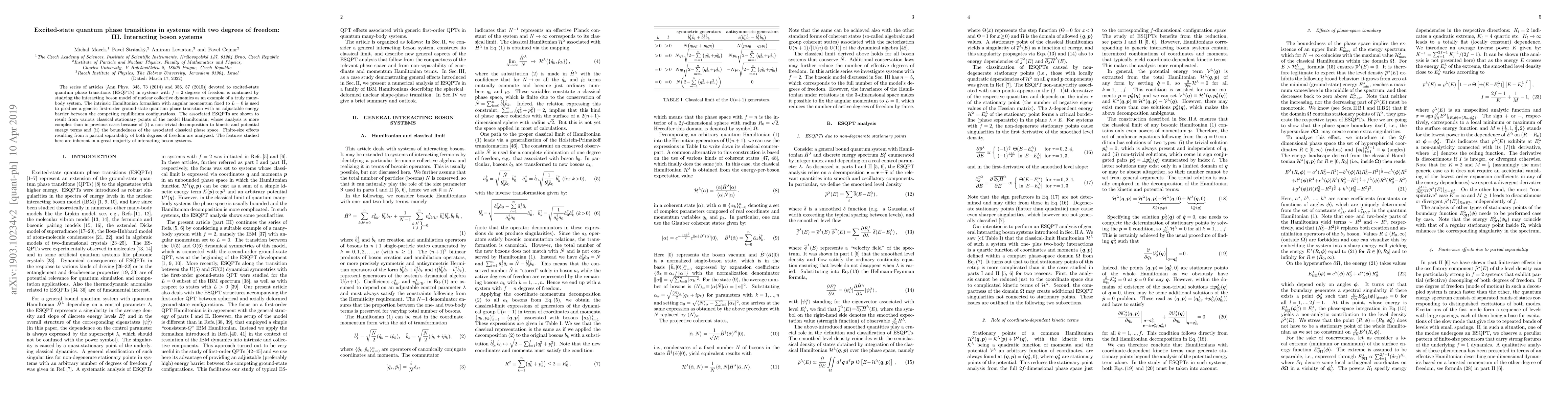 The series of articles [Ann. Phys. 345, 73 (2014) and 356, 57 (2015)] devoted to excited-state quantum phase transitions (ESQPTs) in systems with $f=2$ degrees of freedom is continued by studying the interacting boson model of nuclear collective dynamics as an example of a truly many-body system. The intrinsic Hamiltonian formalism with angular momentum fixed to $L=0$ is used to produce a generic first-order ground-state quantum phase transition with an adjustable energy barrier between the competing equilibrium configurations. The associated ESQPTs are shown to result from various classical stationary points of the model Hamiltonian, whose analysis is more complex than in previous cases because of (i) a non-trivial decomposition to kinetic and potential energy terms and (ii) the boundedness of the associated classical phase space. Finite-size effects resulting from a partial separability of both degrees of freedom are analyzed. The features studied here are inherent in a great majority of interacting boson systems.
