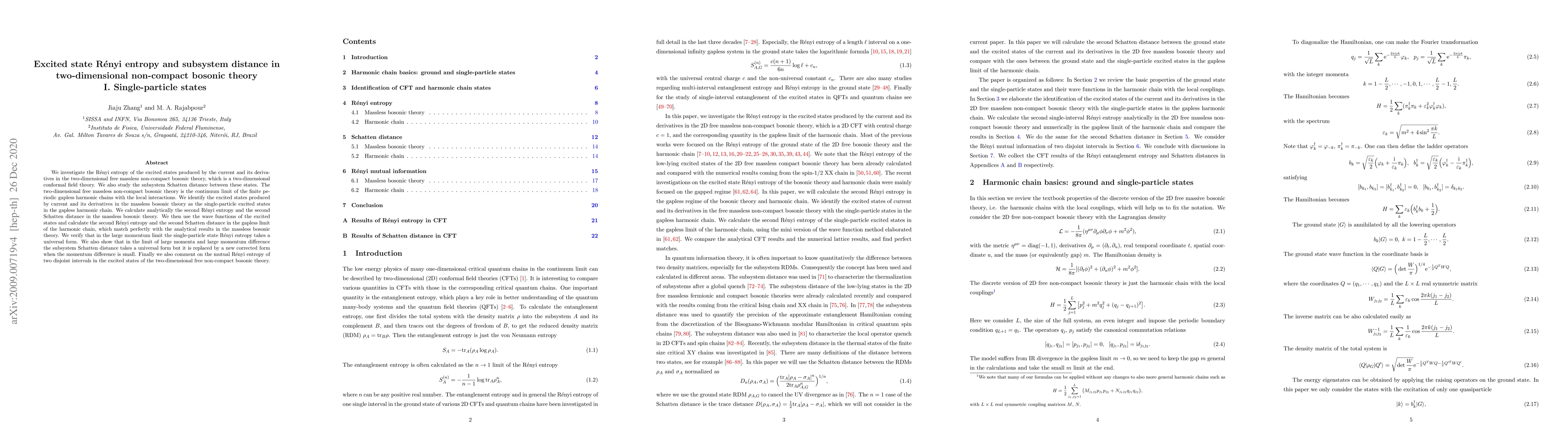 We investigate the R\'enyi entropy of the excited states produced by the current and its derivatives in the two-dimensional free massless non-compact bosonic theory, which is a two-dimensional conformal field theory. We also study the subsystem Schatten distance between these states. The two-dimensional free massless non-compact bosonic theory is the continuum limit of the finite periodic gapless harmonic chains with the local interactions. We identify the excited states produced by current and its derivatives in the massless bosonic theory as the single-particle excited states in the gapless harmonic chain. We calculate analytically the second R\'enyi entropy and the second Schatten distance in the massless bosonic theory. We then use the wave functions of the excited states and calculate the second R\'enyi entropy and the second Schatten distance in the gapless limit of the harmonic chain, which match perfectly with the analytical results in the massless bosonic theory. We verify that in the large momentum limit the single-particle state R\'enyi entropy takes a universal form. We also show that in the limit of large momenta and large momentum difference the subsystem Schatten distance takes a universal form but it is replaced by a corrected form when the momentum difference is small. Finally we also comment on the mutual R\'enyi entropy of two disjoint intervals in the excited states of the two-dimensional free non-compact bosonic theory.