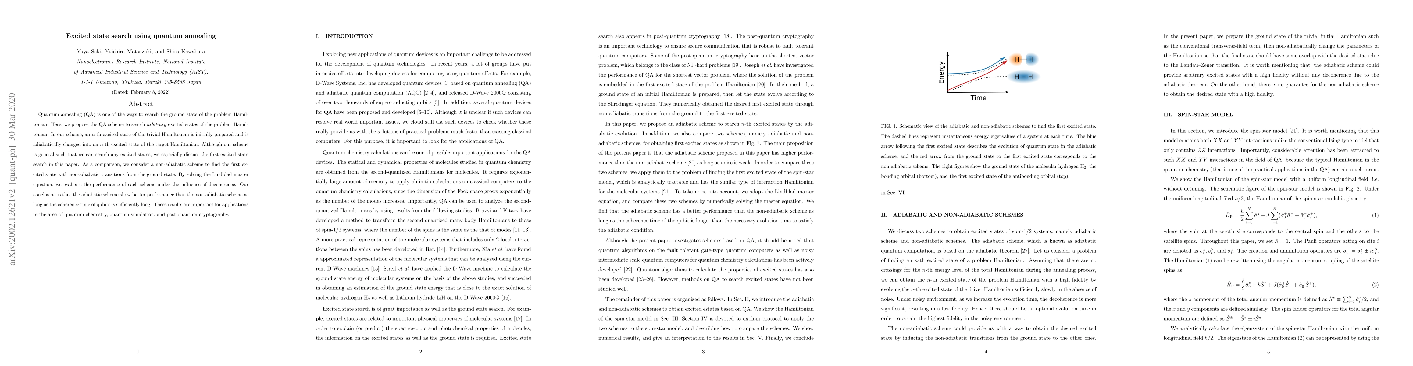 This paper proposes a quantum annealing scheme for searching the first excited state of a problem Hamiltonian, comparing it with a non-adiabatic approach. The adiabatic scheme shows superior performance under sufficient qubit coherence, making it valuable for quantum chemistry, simulation, and cryptography.