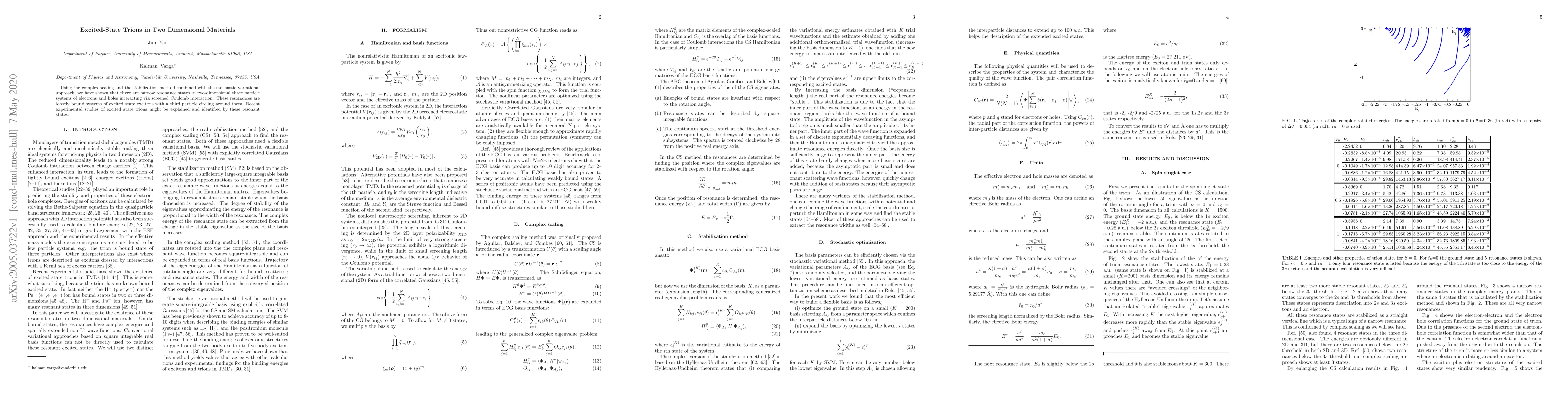 Using the complex scaling and the stabilization method combined with the stochastic variational approach, we have shown that there are narrow resonance states in two-dimensional three particle systems of electrons and holes interacting via screened Coulomb interaction. These resonances are loosely bound systems of excited state excitons with a third particle circling around them. Recent experimental studies of excited state trions might be explained and identified by these resonant states.