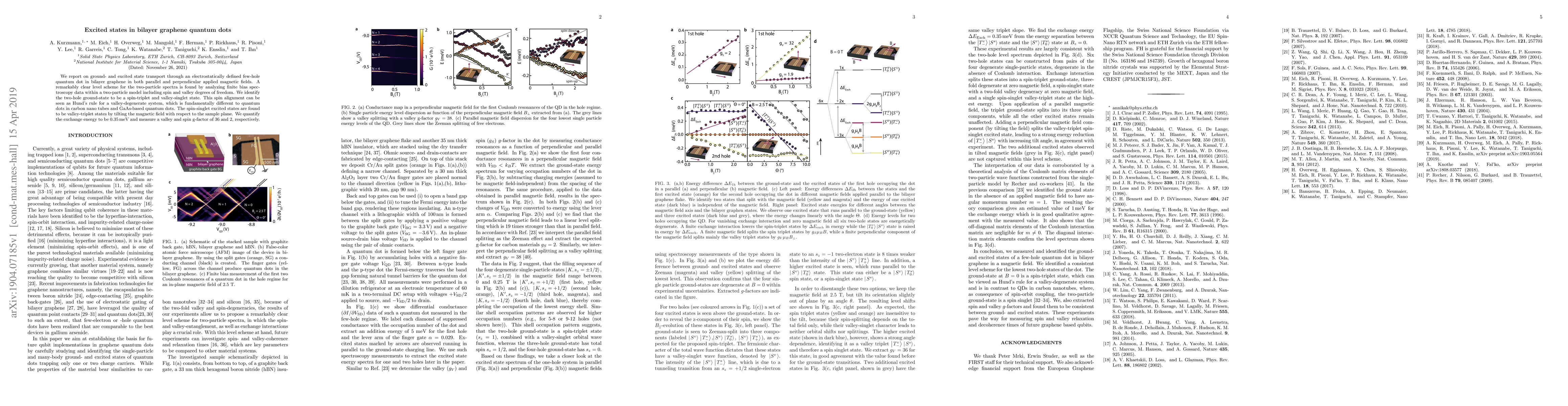 This paper investigates transport through a bilayer graphene quantum dot, revealing a clear two-particle level scheme and identifying the spin-triplet ground state and valley-triplet excited states. The study quantifies an exchange energy of 0.35 meV and determines valley and spin g-factors of 36 and 2, respectively.