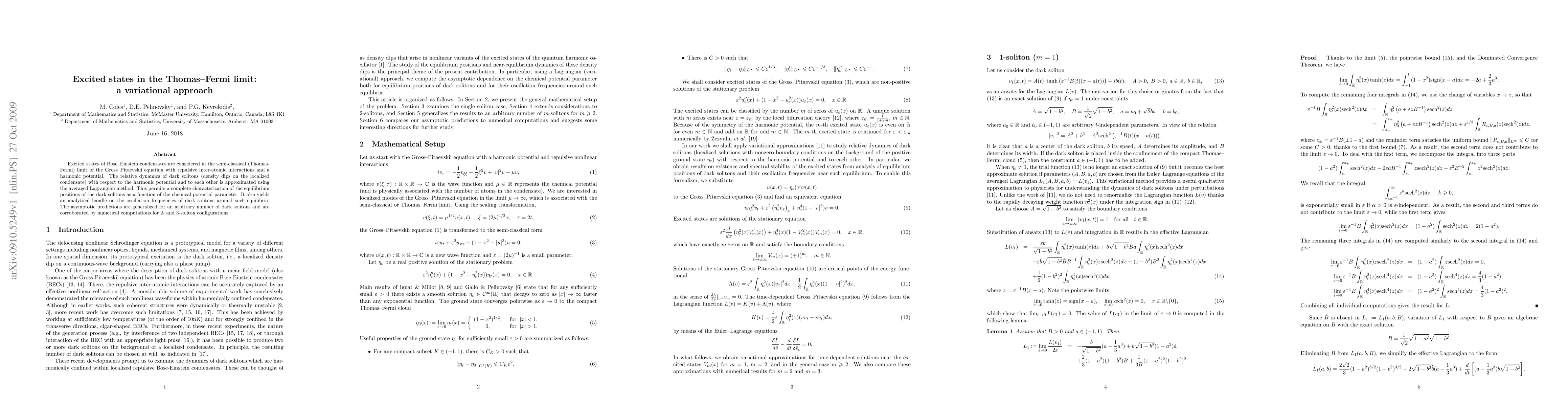 This paper explores excited states in Bose-Einstein condensates within the Thomas-Fermi limit, employing a variational approach to characterize dark solitons' dynamics and equilibria. Analytical results for soliton oscillation frequencies are validated through numerical simulations for configurations with 2 and 3 solitons.