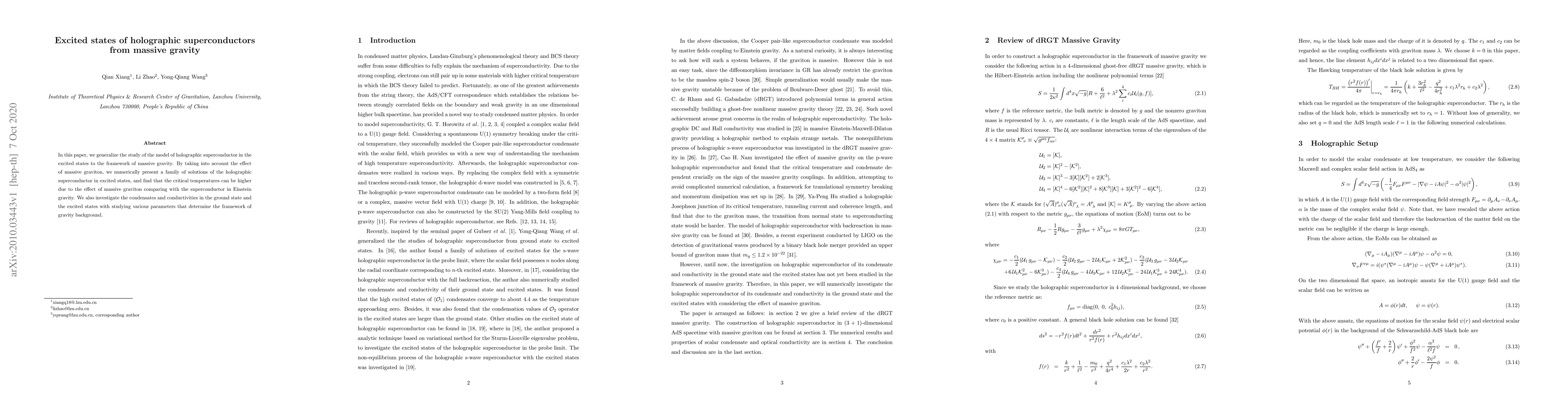 This paper investigates holographic superconductors in excited states within the framework of massive gravity, demonstrating that massive gravitons can raise critical temperatures compared to Einstein gravity. It numerically presents solutions and examines condensates and conductivities across ground and excited states under varying gravity parameters.