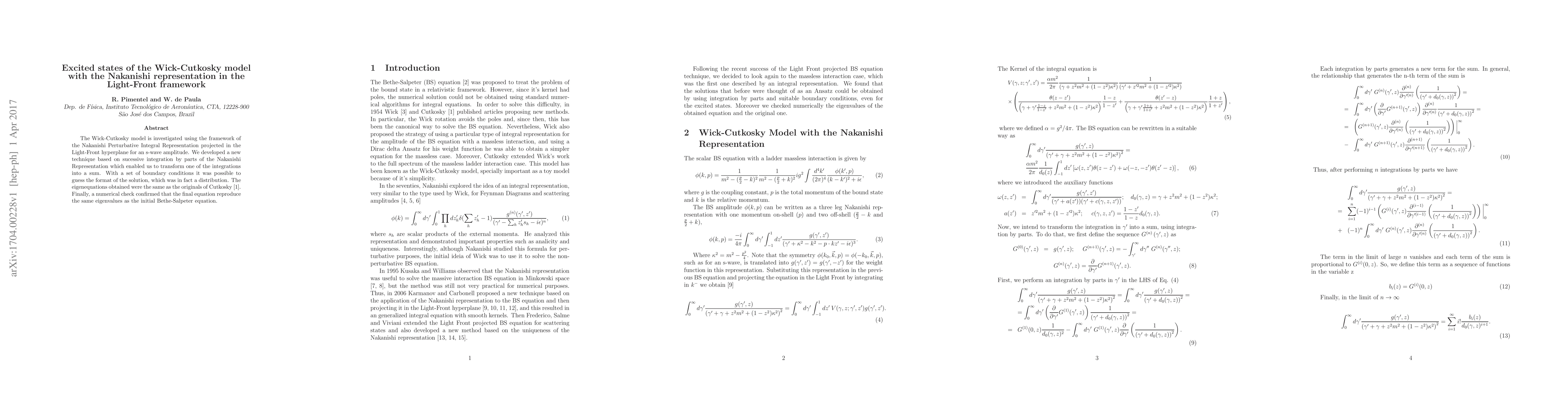 This paper explores the excited states of the Wick-Cutkosky model using the Nakanishi representation within the Light-Front framework. A novel technique was developed to transform the s-wave amplitude, leading to eigenequations matching those of Cutkosky, confirmed numerically to reproduce the same eigenvalues as the initial Bethe-Salpeter equation.