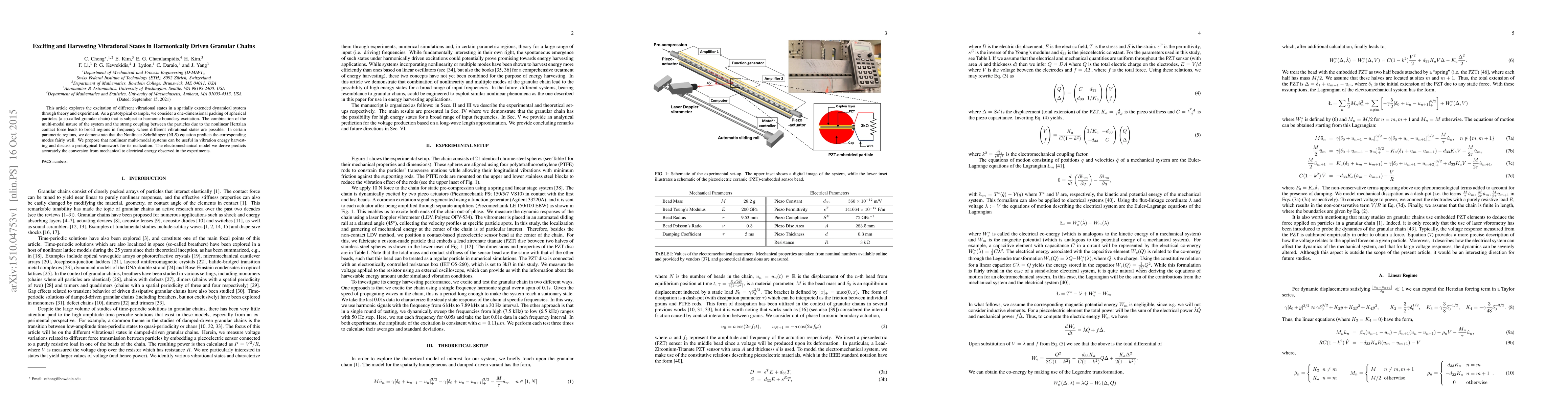 This article explores the excitation of different vibrational states in a spatially extended dynamical system through theory and experiment. As a prototypical example, we consider a one-dimensional packing of spherical particles (a so-called granular chain) that is subject to harmonic boundary excitation. The combination of the multi-modal nature of the system and the strong coupling between the particles due to the nonlinear Hertzian contact force leads to broad regions in frequency where different vibrational states are possible. In certain parametric regions, we demonstrate that the Nonlinear Schrodinger (NLS) equation predicts the corresponding modes fairly well. We propose that nonlinear multi-modal systems can be useful in vibration energy harvest- ing and discuss a prototypical framework for its realization. The electromechanical model we derive predicts accurately the conversion from mechanical to electrical energy observed in the experiments.