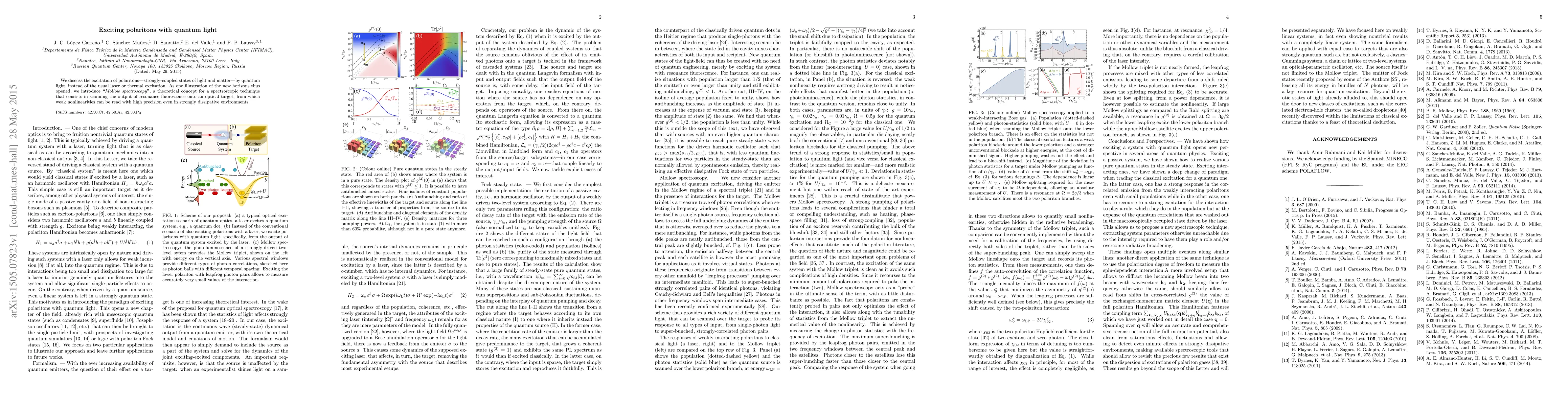 The paper explores exciting polaritons, light-matter states, using quantum light instead of conventional methods. It introduces Mollow spectroscopy, a technique for high-precision nonlinearity reading in dissipative environments via resonance fluorescence scanning.
