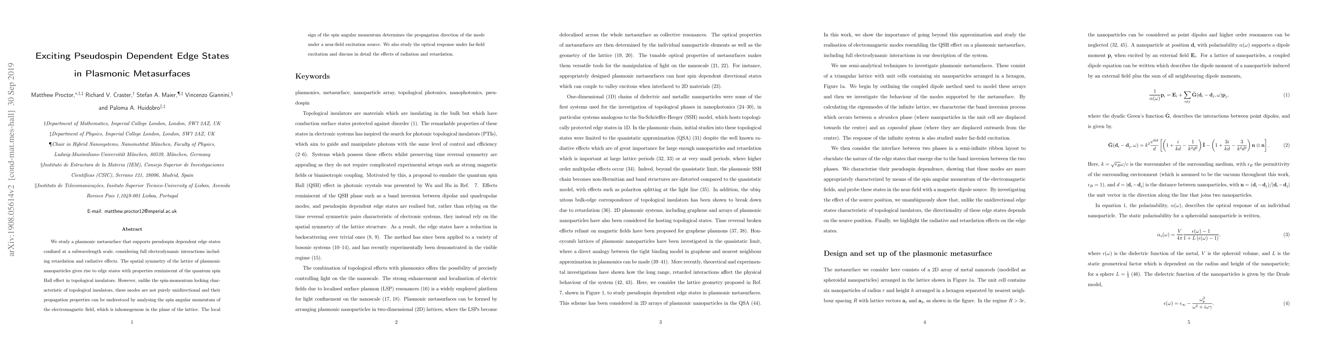 We study a plasmonic metasurface that supports pseudospin dependent edge states confined at a subwavelength scale, considering full electrodynamic interactions including retardation and radiative effects. The spatial symmetry of the lattice of plasmonic nanoparticles gives rise to edge states with properties reminiscent of the quantum spin Hall effect in topological insulators. However, unlike the spin-momentum locking characteristic of topological insulators, these modes are not purely unidirectional and their propagation properties can be understood by analysing the spin angular momentum of the electromagnetic field, which is inhomogenous in the plane of the lattice. The local sign of the spin angular momentum determines the propagation direction of the mode under a near-field excitation source. We also study the optical response under far-field excitation and discuss in detail the effects of radiation and retardation.