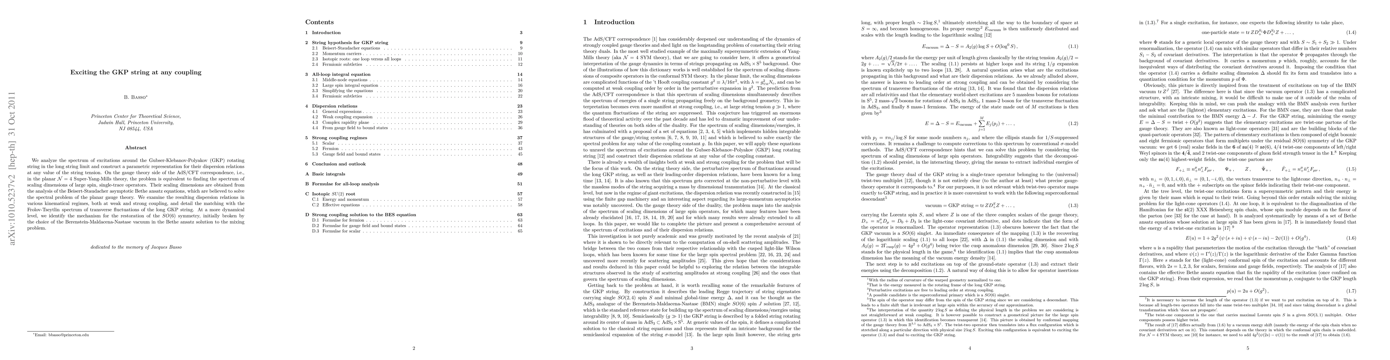 We analyze the spectrum of excitations around the Gubser-Klebanov-Polyakov (GKP) rotating string in the long string limit and construct a parametric representation for their dispersion relations at any value of the string tension. On the gauge theory side of the AdS/CFT correspondence, i.e., in the planar $\mathcal{N}=4$ Super-Yang-Mills theory, the problem is equivalent to finding the spectrum of scaling dimensions of large spin, single-trace operators. Their scaling dimensions are obtained from the analysis of the Beisert-Staudacher asymptotic Bethe ansatz equations, which are believed to solve the spectral problem of the planar gauge theory. We examine the resulting dispersion relations in various kinematical regimes, both at weak and strong coupling, and detail the matching with the Frolov-Tseytlin spectrum of transverse fluctuations of the long GKP string. At a more dynamical level, we identify the mechanism for the restoration of the SO(6) symmetry, initially broken by the choice of the Berenstein-Maldacena-Nastase vacuum in the Bethe ansatz solution to the mixing problem.