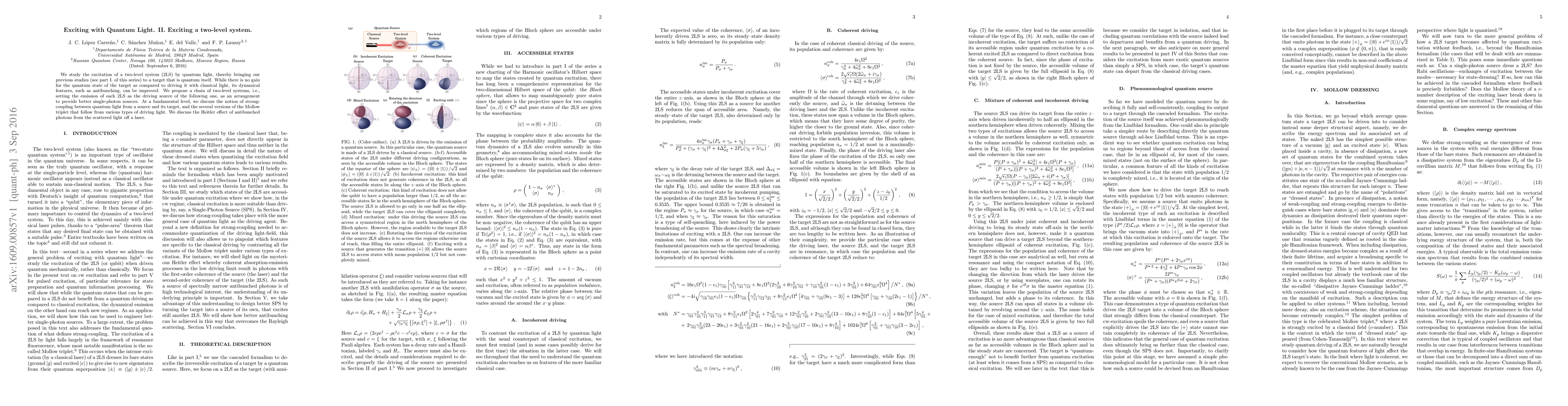 We study the excitation of a two-level system (2LS) by quantum light, thereby bringing our previous studies~(see part~I. of this series) to a target that is quantum itself. While there is no gain for the quantum state of the target as compared to driving it with classical light, its dynamical features, such as antibunching, can be improved. We propose a chain of two-level systems, i.e., setting the emission of each 2LS as the driving source of the following one, as an arrangement to provide better single-photon sources. At a fundamental level, we discuss the notion of strong-coupling between quantum light from a source and its target, and the several versions of the Mollow triplet that follow from various types of driving light. We discuss the Heitler effect of antibunched photons from the scattered light off a laser.