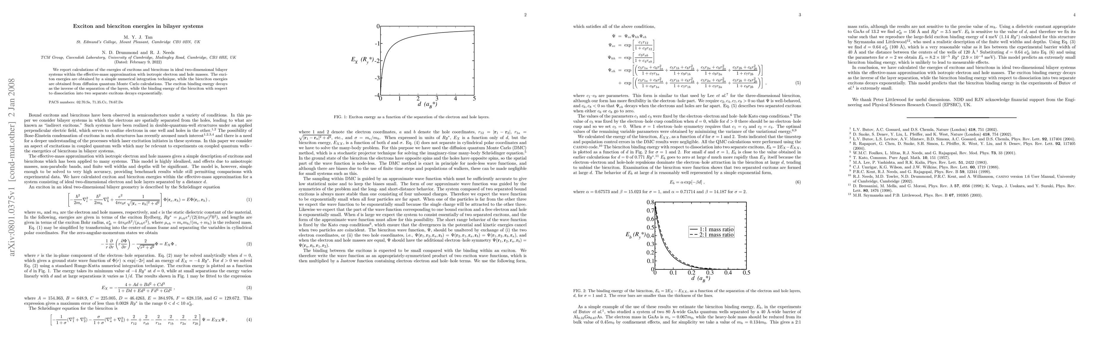 This paper calculates exciton and biexciton energies in ideal two-dimensional bilayer systems using effective-mass approximation, with exciton energies derived via numerical integration and biexciton energies from diffusion quantum Monte Carlo. The study finds that exciton binding energy decreases inversely with layer separation, while biexciton binding energy decays exponentially.