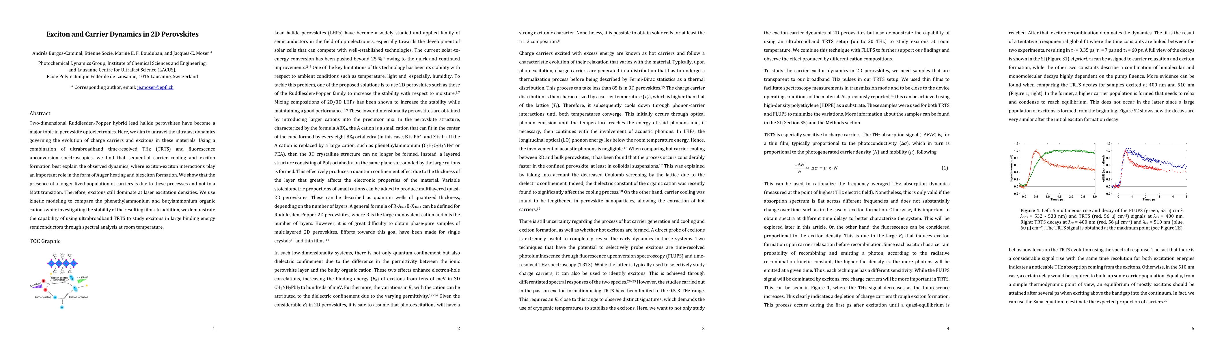 This paper explores the ultrafast dynamics of charge carriers and excitons in 2D Ruddlesden-Popper perovskites using ultrabroadband TRTS and fluorescence upconversion. The study reveals that sequential carrier cooling and exciton formation, with significant exciton-exciton interactions, govern the material's behavior, and kinetic modeling highlights differences between phenethylammonium and butylammonium organic cations.