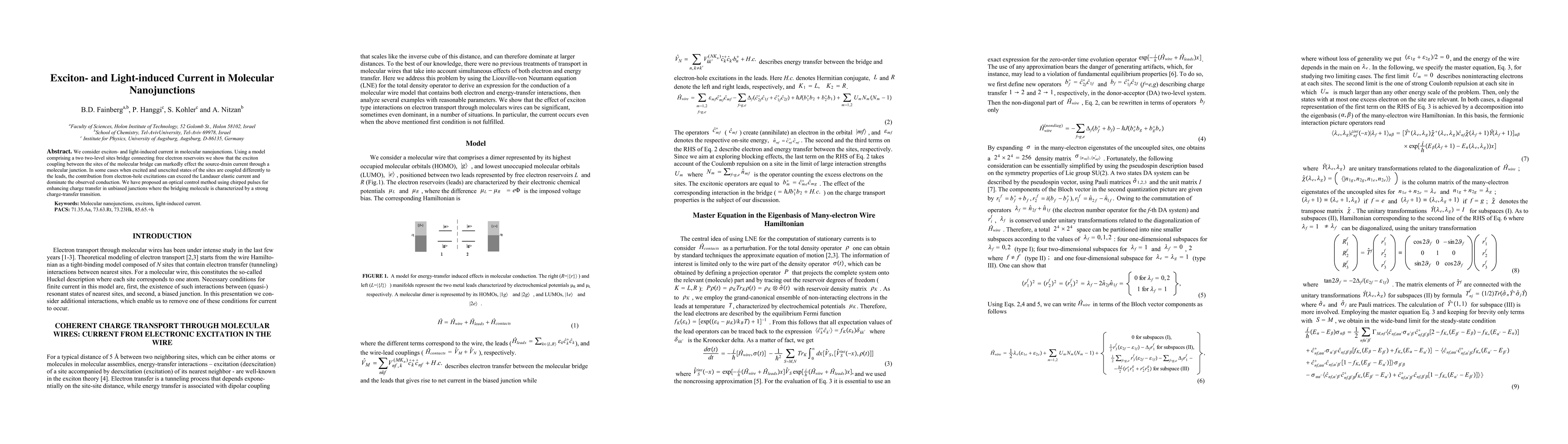 This paper investigates exciton- and light-induced current in molecular nanojunctions, demonstrating that exciton coupling can significantly influence the source-drain current. The study proposes an optical control method using chirped pulses to enhance charge transfer in unbiased junctions, particularly in molecules with strong charge-transfer transitions.