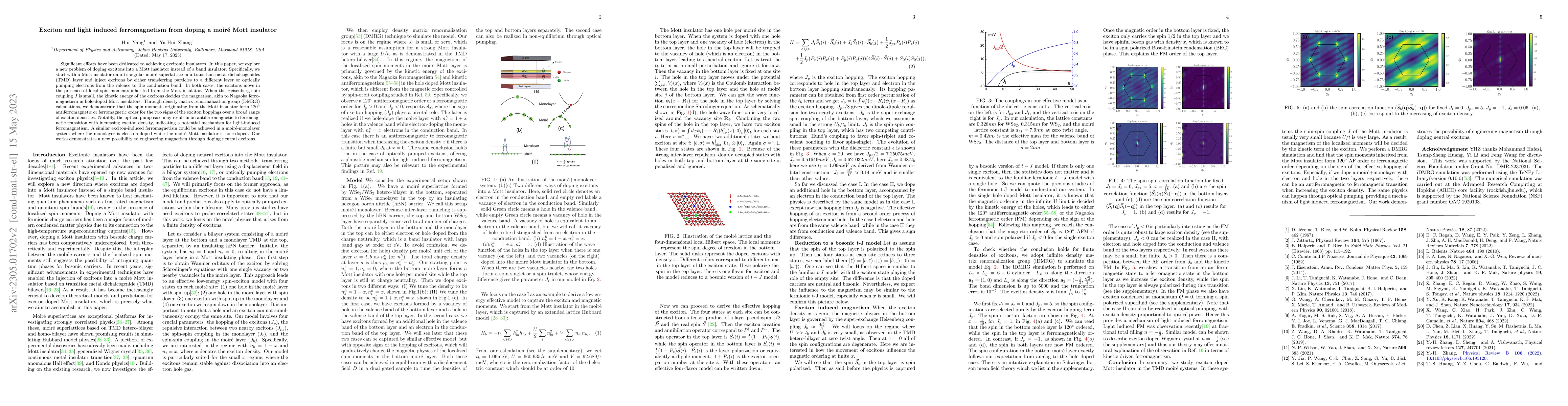 This paper explores doping a Mott insulator with excitons in a triangular moir\'e superlattice of TMDs, showing that excitons can induce ferromagnetism due to kinetic energy effects and local spin moments. Density matrix renormalization group calculations reveal $120^\circ$ antiferromagnetic or ferromagnetic spin order, potentially enabling light-induced ferromagnetism via optical pumping.