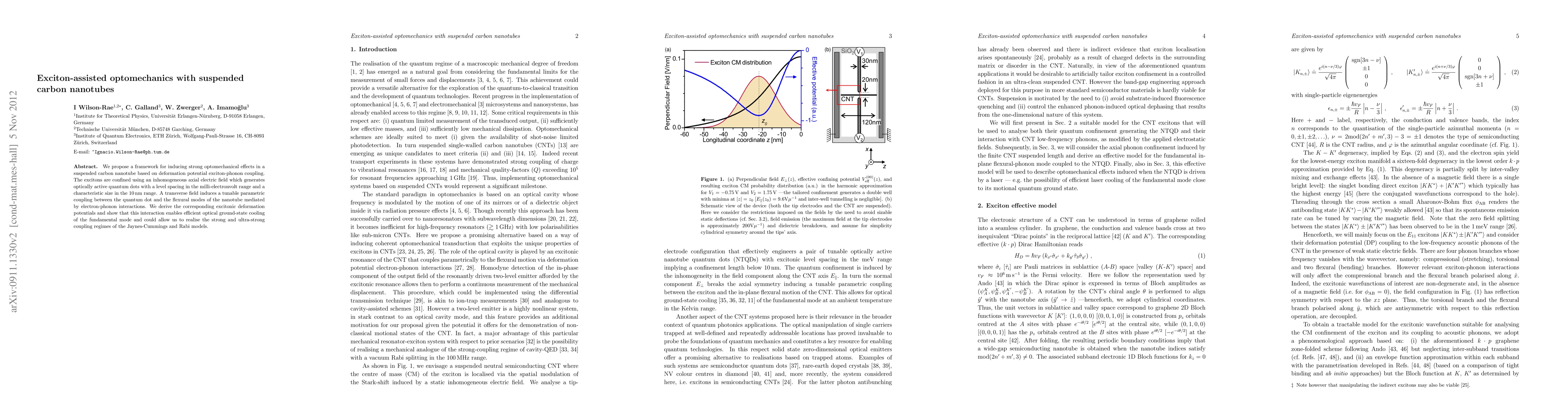 We propose a framework for inducing strong optomechanical effects in a suspended carbon nanotube based on deformation potential exciton-phonon coupling. The excitons are confined using an inhomogeneous axial electric field which generates optically active quantum dots with a level spacing in the milli-electronvolt range and a characteristic size in the 10-nanometer range. A transverse field induces a tunable parametric coupling between the quantum dot and the flexural modes of the nanotube mediated by electron-phonon interactions. We derive the corresponding excitonic deformation potentials and show that this interaction enables efficient optical ground-state cooling of the fundamental mode and could allow us to realise the strong and ultra-strong coupling regimes of the Jaynes-Cummings and Rabi models.
