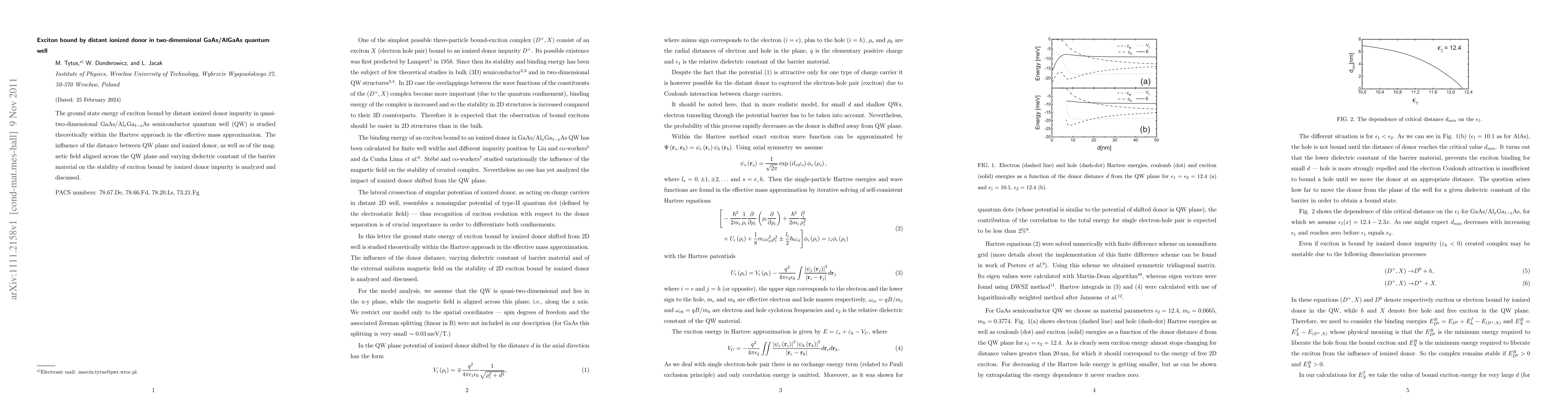 This paper theoretically investigates the ground state energy of an exciton bound to a distant ionized donor in a quasi-two-dimensional GaAs/AlGaAs quantum well using the Hartree approach. It examines how the distance from the quantum well plane, magnetic field, and dielectric constant of the barrier material affect the stability of this exciton-donor complex.