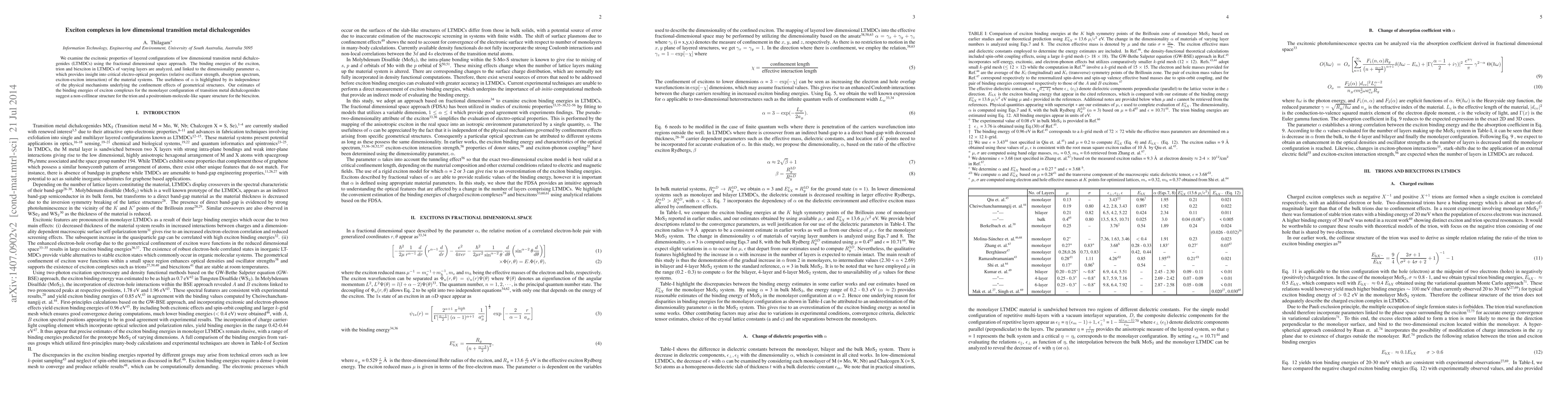 This paper analyzes excitonic properties in layered low dimensional transition metal dichalcogenides using a fractional dimensional space approach. The study links the binding energies of exciton complexes to a dimensionality parameter $\alpha$, revealing insights into critical electro-optical properties and predicting non-collinear and square structures for trions and biexcitons, respectively.