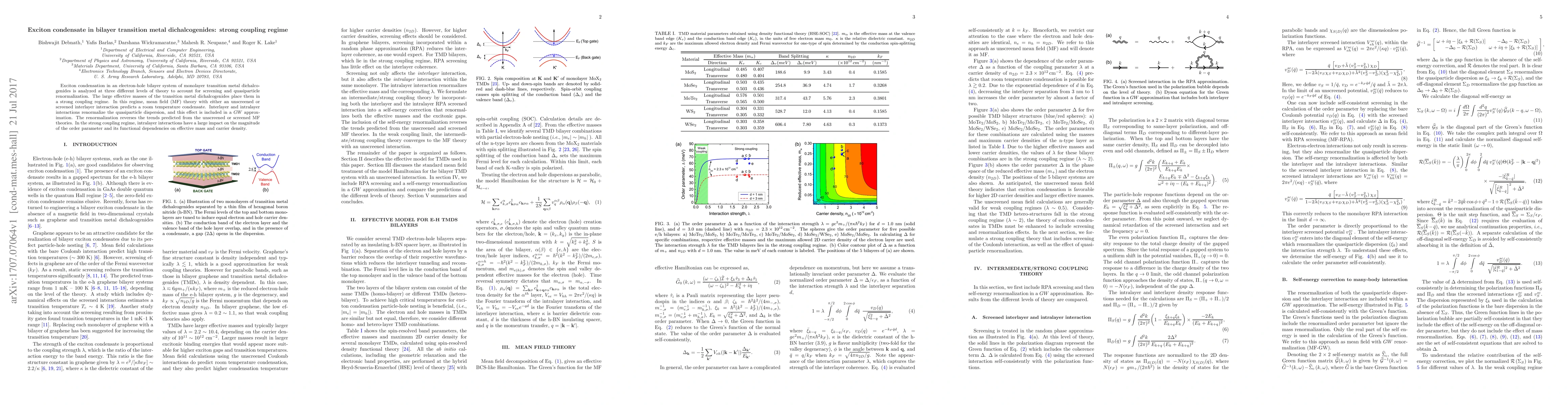 Exciton condensation in an electron-hole bilayer system of monolayer transition metal dichalcogenides is analyzed at three different levels of theory to account for screening and quasiparticle renormalization. The large effective masses of the transition metal dichalcogenides place them in a strong coupling regime. In this regime, mean field (MF) theory with either an unscreened or screened interlayer interaction predicts a room temperature condensate. Interlayer and intralayer interactions renormalize the quasiparticle dispersion, and this effect is included in a GW approximation. The renormalization reverses the trends predicted from the unscreened or screened MF theories. In the strong coupling regime, intralayer interactions have a large impact on the magnitude of the order parameter and its functional dependencies on effective mass and carrier density.